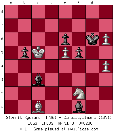 Last move : 0-1 2016 January 23 9:40:50 [Event "FICGS__CHESS__RAPID_B__000236"] [Site "FICGS"] [Date "2015.12.07"] [Round "1"] [White "Sternik,Ryszard"] [Black "Cirulis,Ilmars"] [Result "0-1"] [WhiteElo "1796"] [BlackElo "1891"] 1.c4 a6 2.d4 e6 3.Nf3 d5 4.Nc3 dxc4 5.a4 Nc6 6.e3 Na5 7.Ne5 c5 8.Bxc4 Nf6 9.Bd3 b6 10.Bc2 Bb7 11.O-O Qc7 12.f4 Nc6 13.Nxc6 Qxc6 14.Qe2 Rd8 15.Rd1 Be7 16.dxc5 Rxd1+ 17.Nxd1 Bxc5 18.Bd2 O-O 19.b4 Be7 20.Rc1 Qd7 21.Nf2 Rc8 22.Nd3 a5 23.h3 axb4 24.Nxb4 Bc5 25.Rd1 Qc7 26.Kh2 Bd6 27.Bb3 Ne4 28.Rc1 Qb8 29.Rxc8+ Qxc8 30.Qd1 g5 31.Nd3 Qc6 32.Nb4 Qc7 33.Nd3 h5 34.Bc1 gxf4 35.Nxf4 Qc5 36.Bc2 Kf8 37.Bxe4 Bxe4 38.Qd2 Ke7 39.Bb2 Qc2 40.Qxc2 Bxc2 41.g3 h4 42.gxh4 f6 43.h5 Bxa4 44.Kg2 Bc6+ 45.Kf2 Kf7 46.h6 Be4 47.Nh5 Be7 48.Ng3 Bd3 49.Bc1 b5 50.e4 Kg6 51.Ke3 Bc4 52.Kd4 Bd6 53.Nh1 Be5+ 54.Kc5 Bc3 55.Nf2 Be2 56.e5 f5 57.h4 Bf1 0-1 English Opening Kingside Castling by player White (move 11) Kingside Castling by player Black (move 18) Player Black won this chess game. Follow this game move after move (download)Chess makes man wiser and clear-sighted. (Vladimir Putin) Ich glaube, ich kenne inzwischen die Gründe für mein Versagen: schachliche Charakterfehler. Ich war nie ein Wunderkind und in meiner gesamten menschlichen Entwicklung immer zu langsam. (Viktor Kortschnoi) La última cosa en que Fischer estaba interesado era en tonterías, siempre y cuando el Ajedrez estuviera involucrado. (Elie Agur) Si rien de grave n'est détecté lors de l'analyse d'une position, on joue alors le coup. Seconde règle de Blumenfeld. Wipe them out. All of them. (Darth Sidious in Star Wars ep.1)