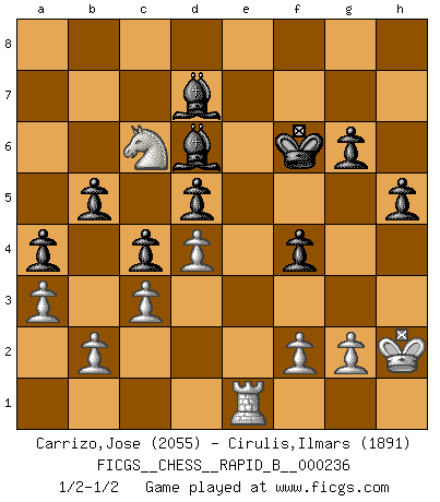 Last move : 1/2-1/2 2016 January 29 18:26:11 [Event "FICGS__CHESS__RAPID_B__000236"] [Site "FICGS"] [Date "2015.12.07"] [Round "1"] [White "Carrizo,Jose"] [Black "Cirulis,Ilmars"] [Result "1/2-1/2"] [WhiteElo "2055"] [BlackElo "1891"] 1.e4 a6 2.d4 e6 3.Nf3 d5 4.Nc3 Nf6 5.e5 Nfd7 6.Ne2 c5 7.c3 Nc6 8.a3 Be7 9.Ng3 c4 10.Nh5 g6 11.Nf4 b5 12.Be2 Na5 13.Be3 Nb3 14.Rb1 a5 15.Nd2 a4 16.Nf3 Bf8 17.h4 h6 18.Qc2 Nb8 19.Bd1 Nc6 20.Qe2 Ne7 21.Bc2 Bg7 22.Rh3 Ra6 23.Kf1 Nf5 24.Kg1 Rc6 25.Ne1 O-O 26.Bxf5 exf5 27.Nc2 Bb7 28.Nb4 Rb6 29.Qc2 Re8 30.Re1 Bf8 31.Rg3 Qd7 32.Bc1 Kh7 33.e6 Rbxe6 34.Rxe6 Rxe6 35.Nxe6 Qxe6 36.Re3 Qf6 37.h5 Bd6 38.hxg6+ fxg6 39.Re1 Kg7 40.Qe2 Nxc1 41.Rxc1 Qe7 42.Qxe7+ Bxe7 43.Nc2 f4 44.Ne1 Bd6 45.Nf3 Bc8 46.Re1 Kf7 47.Ne5+ Kg7 48.Nc6 Kf7 49.Kh2 h5 50.Ne5+ Kf6 51.Nc6 Bd7 1/2-1/2 St. George (Baker) defense Kingside Castling by player Black (move 25) This chess game ended in a draw. Follow this game move after move (download)The chessboard is the world, the pieces are the phenomena of the Universe, the rules of the game are what we call the laws of Nature and the player on the other side is hidden from us. (Thomas Huxley) Wenn Dein Gegner dir ein Remis anbietet, versuch herauszufinden, weshalb er glaubt schlechter zu stehen. (Nigel Short) Un mal día en el Ajedrez, es mejor que cualquier buen día en el trabajo. (Anonymous) A ce moment-là, je menaçais de comprendre la position ! (Clément L'Heureux) Whatever you do, don't be bored. This is absolutely the most exciting time we could have possibly hoped to be alive. And things are just starting. (From movie Waking life)