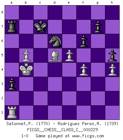 Last move : 1-0 2016 December 27 17:43:19 [Event "FICGS__CHESS__CLASS_C__000229"] [Site "FICGS"] [Date "2015.12.10"] [Round "1"] [White "Satonnet,Patrick"] [Black "Rodriguez Perez,Rene"] [Result "1-0"] [WhiteElo "1770"] [BlackElo "1739"] 1.Nf3 d5 2.c4 e6 3.g3 Nf6 4.Bg2 Be7 5.O-O O-O 6.d4 dxc4 7.Qc2 a6 8.a4 Bd7 9.Qxc4 Bc6 10.Bg5 Nbd7 11.Nc3 h6 12.Bxf6 Nxf6 13.b4 Bd5 14.Nxd5 exd5 15.Qb3 c6 16.e3 Bd6 17.Rfc1 Re8 18.Ne1 Qb6 19.Rab1 Ne4 20.Qd1 Qc7 21.Nd3 Qd7 22.b5 cxb5 23.axb5 a5 24.Nc5 Bxc5 25.dxc5 Rac8 26.Qd4 a4 27.Qb4 h5 28.h4 Qe6 29.Rc2 Ra8 30.Ra1 Qg6 31.c6 Nxg3 32.cxb7 Qxc2 33.bxa8Q Ne2+ 34.Kf1 Rxa8 35.Bxd5 Nf4 36.Qc4 Qxc4+ 37.Bxc4 Ne6 38.Ke2 Nc5 39.Kd2 Ne4+ 40.Kd3 Nd6 41.Kd4 a3 42.Bf1 Kf8 43.Kc5 Ke7 44.Kb4 f6 45.Bg2 Ra7 46.f4 Kd7 47.Bd5 Kc8 48.e4 Kc7 49.e5 1-0 Reti Opening Kingside Castling by player White (move 5) Kingside Castling by player Black (move 5) Promotion Queen by player White (move 33) Player White won this chess game. Follow this game move after move (download)Chess is played with the mind and not with the hands ! (Renaud and Kahn) Das Schachspiel ist ein See, in welchem eine Mücke baden und ein Elefant ertrinken kann. (Emanuel Lasker) Evita las multitudes. Haz independientemente tu propio razonamiento. Trata de ser el jugador de Ajedrez, no la pieza de Ajedrez. (Ralph Charell) Les écrivains ont utilisé les échecs pour analyser les côtés extrêmes de la nature humaine. Dans ce cadre, les échecs offrent un champ d'expérimentation idéal. Mais on pourrait faire la même chose avec la peinture. Et là, en vous référant à Van Gogh, vous ne tirerez pas de conclusion définitive sur les peintres. (Gary Kasparov) I believe in luck. How else can you explain the success of those you dislike ? (Jean Cocteau)