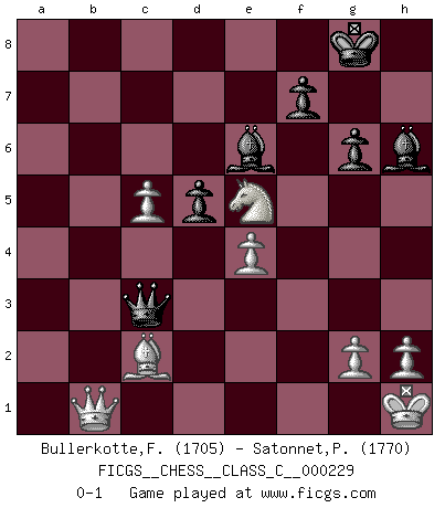 Last move : 0-1 2016 November 28 6:49:54 [Event "FICGS__CHESS__CLASS_C__000229"] [Site "FICGS"] [Date "2015.12.10"] [Round "1"] [White "Bullerkotte,Frank"] [Black "Satonnet,Patrick"] [Result "0-1"] [WhiteElo "1705"] [BlackElo "1770"] 1.d4 Nf6 2.c4 g6 3.Nc3 Bg7 4.e4 d6 5.Be2 O-O 6.Bg5 Na6 7.f4 c6 8.Nf3 Nc7 9.O-O Ne6 10.f5 Nxg5 11.Nxg5 Ne8 12.fxg6 hxg6 13.Nf3 e5 14.d5 Nf6 15.Qd3 cxd5 16.Nxd5 Nxd5 17.Qxd5 Bh6 18.Kh1 Be6 19.Qxb7 Rb8 20.Qxa7 Rxb2 21.Bd3 Qc8 22.Qa3 Rb6 23.Rfb1 Rxb1+ 24.Rxb1 Qc6 25.Qb4 Ra8 26.Ra1 Ra4 27.Qb5 Qa8 28.c5 d5 29.Bc2 Rxa2 30.Rxa2 Qxa2 31.Qb1 Qc4 32.Nxe5 Qc3 0-1 This chess game has been lost on time (started : 2015.12.10 19:16:40) King's Indian : Averbakh system Kingside Castling by player Black (move 5) Kingside Castling by player White (move 9) Player Black won this chess game. Follow this game move after move (download)First-class players lose to second class players because second-class players sometimes play a first-class game. (Tarrasch) Wenn man heute mit 14 Jahren noch kein GM ist, kann man es vergessen. (Viswanathan Anand) No es tiempo de jugar al Ajedrez cuando la casa esta en llamas. (Proverbio Italiano) Nous vivons dans un monde échiquéen : chaque jour qui passe est un défi à relever. (Philosophe Sasha) He is a liar. I just don't know what the lie is yet. (Horatio Caine, C.S.I. Miami)