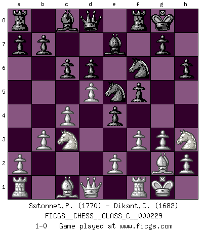 Last move : 1-0 2016 April 4 19:9:33 [Event "FICGS__CHESS__CLASS_C__000229"] [Site "FICGS"] [Date "2015.12.10"] [Round "1"] [White "Satonnet,Patrick"] [Black "Dikant,Christophe"] [Result "1-0"] [WhiteElo "1770"] [BlackElo "1682"] 1.Nf3 d6 2.c4 e5 3.Nc3 f5 4.g3 Nf6 5.Bg2 Be7 6.O-O O-O 7.d4 e4 8.Ng5 c6 9.d5 h6 10.Nh3 Nbd7 11.f3 Ne5 12.b3 1-0 Reti Opening Kingside Castling by player White (move 6) Kingside Castling by player Black (move 6) Player White won this chess game. Follow this game move after move (download)The combination player thinks forward; he starts from the given position, and tries the forceful moves in his mind. (Emanuel Lasker) Konzentriere dich auf materielle Gewinne. Nimm, was dir dein Gegner gibt, ausser es gibt einen guten Grund der dagegenspricht. (Robert James Fischer) Los libros de Ajedrez deben de usarse igual como usamos los anteojos: para mejorar la vista, aunque algunos jugadores los quieren usar como si ellos les otorgaran la vision. (José Raúl Capablanca) La guerre est enfant de la passion, la passion est enfant du narcissisme et le narcissisme est l'enfant. (...) Une autre partie ? (Thibault de Vassal) There is no vagueness without wind. (Chinese proverb)