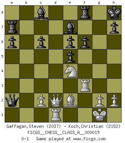 Last move : 0-1 2007 June 25 2:49:15 [Event "FICGS__CHESS__CLASS_A__000019"] [Site "FICGS"] [Date "2007.03.19"] [Round "1"] [White "Gaffagan,Steven"] [Black "Koch,Christian"] [Result "0-1"] [WhiteElo "2037"] [BlackElo "2152"] 1.e4 c5 2.Nf3 d6 3.d4 cxd4 4.Nxd4 Nf6 5.Nc3 a6 6.Bg5 e6 7.f4 Qb6 8.Qd2 Qxb2 9.Rb1 Qa3 10.f5 Nc6 11.fxe6 fxe6 12.Nxc6 bxc6 13.e5 dxe5 14.Bxf6 gxf6 15.Ne4 Qxa2 16.Rd1 Be7 17.Be2 O-O 18.O-O Ra7 19.Rf3 Kh8 0-1 This chess game has been lost on time (started : 2007.03.19 18:55:57) Sicilian : Najdorf, 7...Qb6 Kingside Castling by player Black (move 17) Kingside Castling by player White (move 18) Player Black won this chess game. Follow this game move after move (download)Human affairs are like a Chess game: only those who do not take it seriously can be called good players. (Hung Tzu Ch'eng) Es hat in meinem Leben Zeiten gegeben, in denen das Schachspiel, wenn nicht zum Lebenszweck, so doch zu einem regelrechten Lebensersatz geworden ist. Man fühlt sich in solchen Zeiten nicht so, als besäße man eine göttliche Gabe, sondern eher so, als sei man von ihr besessen. (Garry Kasparov) El tablero es el mundo, las piezas es el fenomeno del universo, las reglas del juego son lo que llamamos leyes de la naturaleza y el jugador del lado opuesto, se encuentra oculto a nuestra vista. (Thomas Huxley) Tout change constamment, y compris dans le monde des Echecs. (Botvinnik) Faith : not wanting to know what is true. (Friedrich Nietzsche)
