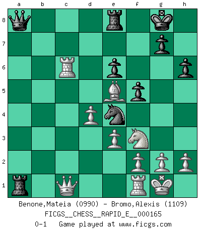 Last move : 0-1 2016 March 4 17:35:57 [Event "FICGS__CHESS__RAPID_E__000165"] [Site "FICGS"] [Date "2015.12.13"] [Round "1"] [White "Benone,Mateia"] [Black "Bromo,Alexis"] [Result "0-1"] [WhiteElo "0990"] [BlackElo "1109"] 1.Nf3 d5 2.d4 Nc6 3.c4 e6 4.Nc3 h6 5.Bf4 Nf6 6.e3 Bb4 7.Rc1 a6 8.a3 Bxc3+ 9.bxc3 O-O 10.cxd5 Nxd5 11.Bg3 Re8 12.c4 Nf6 13.Bd3 Bd7 14.O-O b5 15.cxb5 axb5 16.Bxb5 Ne4 17.Bxc6 Bxc6 18.Rxc6 Rxa3 19.Bxc7 Qa8 20.Qc2 f5 21.Be5 Ra2 22.Qc1 Ra1 0-1 This chess game has been lost on time (started : 2015.12.13 4:19:34) Reti Opening Kingside Castling by player Black (move 9) Kingside Castling by player White (move 14) Player Black won this chess game. Follow this game move after move (download)I like to say that Bobby Fischer was the greatest player ever. But what made Fischer a genius was his ability to blend an American freshness and pragmatism with Russian ideas about strategy. (Bruce Pandolfini) Habe Mut, dich deines eigenen Verstandes zu bedienen. (Immanuel Kant) Si yo gano un torneo, yo lo gano por mí mismo. Yo hago las jugadas. Nadie me ayuda. (Bobby Fischer) Même si vous avez un bon coup à faire, regardez toujours s'il n'y en a pas un qui lui soit préférable. (Pedro Damiano) A good teacher is like a candle - it consumes itself to light the way for others. (Author unknown)