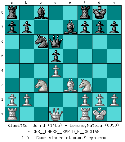 Last move : 1-0 2016 February 7 14:0:16 [Event "FICGS__CHESS__RAPID_E__000165"] [Site "FICGS"] [Date "2015.12.13"] [Round "1"] [White "Klawitter,Bernd"] [Black "Benone,Mateia"] [Result "1-0"] [WhiteElo "1466"] [BlackElo "0990"] 1.e4 c5 2.c3 Nf6 3.e5 Nd5 4.d4 cxd4 5.cxd4 Nc6 6.Bc4 e6 7.Nf3 d6 8.Bxd5 exd5 9.O-O Be7 10.exd6 Qxd6 11.Be3 O-O 12.Nc3 1-0 This chess game has been lost on time (started : 2015.12.13 4:19:34) Sicilian : Alapin's variation (2.c3) Kingside Castling by player White (move 9) Kingside Castling by player Black (move 11) Player White won this chess game. Follow this game move after move (download)War is the child of passion, passion is the child of narcissism and narcissism is the child. (...) Another game ? (Thibault de Vassal) Ich bin der einzige Schachspieler, der sich während der Vorbereitungen zum Turnier verletzt hat. (Woody Allen) Sin errores no puede haber brillantez. (Emanuel Lasker) Karpov est une pièce de musée. (Garry Kasparov) It's unlucky to be superstitious. (Dave Enteles)