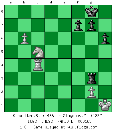 Last move : 1-0 2016 January 25 12:24:36 [Event "FICGS__CHESS__RAPID_E__000165"] [Site "FICGS"] [Date "2015.12.13"] [Round "1"] [White "Klawitter,Bernd"] [Black "Stoyanov,Zdravko"] [Result "1-0"] [WhiteElo "1466"] [BlackElo "1227"] 1.e4 c5 2.c3 a6 3.Nf3 Nc6 4.d3 h6 5.Be2 d6 6.O-O e5 7.Kh1 Nf6 8.h3 Be7 9.Nh2 O-O 10.f4 exf4 11.Bxf4 b5 12.Ng4 Nxg4 13.Bxg4 Bxg4 14.Qxg4 Bg5 15.Bxg5 Ne5 16.Bxd8 Nxg4 17.hxg4 Rfxd8 18.Nd2 d5 19.exd5 Rxd5 20.Rf3 Rad8 21.Ne4 Rxd3 22.Rxd3 Rxd3 23.Nxc5 Rd2 24.b4 Rc2 25.Nxa6 Rxc3 26.a4 bxa4 27.Rxa4 Rc4 28.Nc5 Rxg4 29.b5 Rg5 30.Rc4 Rg3 31.b6 1-0 Sicilian : Alapin's variation (2.c3) Kingside Castling by player White (move 6) Kingside Castling by player Black (move 9) 10 pieces endgame at move 28 : White KRNPP , Black KRPPP WHITE : King + 1 Rook 1 Knight 2 Pawns BLACK : King + 1 Rook 3 Pawns Player White won this chess game. Follow this game move after move (download)It is difficult to play against Einstein's theory --on his first loss to Fischer. (Mikhail Tal) Es ist nicht das erste mal, dass sich die FIDE dem Arabischen Geld gebeugt hat (über die FIDE WM 2004 in Lybien). (Larry Evans) Por esta medida (el intervalo entre Fischer y sus contemporaneos), yo le considero el mas grande campeón mundial. (Garry Kasparov) Ce n'est pas pour s'amuser qu'il joue aux échecs : il célèbre un culte. (Vladimir Nabokov) If you are good, you will be assigned all the work. If you are really good, you will get out of it. (Dan Rotaru)
