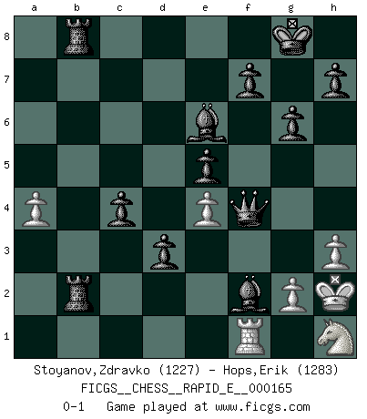 Last move : 0-1 2016 January 25 12:25:31 [Event "FICGS__CHESS__RAPID_E__000165"] [Site "FICGS"] [Date "2015.12.13"] [Round "1"] [White "Stoyanov,Zdravko"] [Black "Hops,Erik"] [Result "0-1"] [WhiteElo "1227"] [BlackElo "1283"] 1.e4 e5 2.Nf3 Nc6 3.Bb5 a6 4.Bxc6 dxc6 5.h3 Bd6 6.O-O Ne7 7.d3 O-O 8.a3 c5 9.c4 Nc6 10.Re1 Be6 11.Nc3 Nd4 12.Nxd4 cxd4 13.Ne2 b5 14.cxb5 axb5 15.Bd2 c5 16.Ng3 g6 17.Bh6 Re8 18.Kh2 c4 19.dxc4 bxc4 20.Rc1 Qe7 21.Qf3 Reb8 22.Rc2 Rb3 23.Qd1 Rab8 24.Qc1 d3 25.Rc3 Rxb2 26.Qa1 Bc5 27.Rf1 Qh4 28.Be3 Bxe3 29.Qe1 Bd2 30.Qd1 Bxc3 31.Qa4 Bd4 32.Qa7 Bxa7 33.a4 Bxf2 34.Nh1 Qf4+ 0-1 Ruy Lopez : Exchange variation Kingside Castling by player White (move 6) Kingside Castling by player Black (move 7) Player Black won this chess game. Follow this game move after move (download)Your body has to be in top condition. Your Chess deteriorates as your body does. You can't separate body from mind. (Bobby Fischer) Wenn du gegen Bobby spielst, ist es keine Frage von gewinnen oder verlieren. Es ist eine Frage des Überlebens. (Boris Vassilievich Spassky) Morphy probablemente fue el genio más grande de todos. (Bobby Fischer) Vous savez, camarade Pachman, je n'éprouve pas de plaisir à être ministre, je jouerais plutôt aux échecs comme vous, ou alors ferais une révolution au Venezuela. (Che Guevara à Ludek Pachman, 'Checkmate in Prague', 1975) To send light into the darkness of men's hearts - such is the duty of the artist. (Schumann)