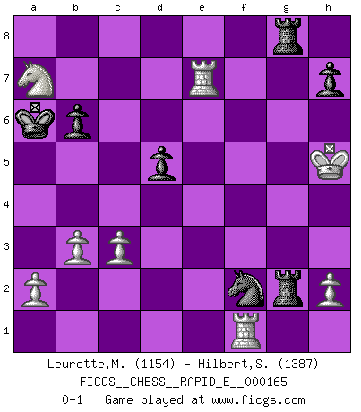 Last move : 0-1 2016 January 26 19:39:27 [Event "FICGS__CHESS__RAPID_E__000165"] [Site "FICGS"] [Date "2015.12.13"] [Round "1"] [White "Leurette,Marc-Antoine"] [Black "Hilbert,Stephan J."] [Result "0-1"] [WhiteElo "1154"] [BlackElo "1387"] 1.e4 d5 2.exd5 Qxd5 3.Nc3 Qa5 4.d4 Nf6 5.Bd2 c6 6.Ne4 Qc7 7.Nxf6+ gxf6 8.Bd3 Be6 9.Qh5 Nd7 10.Bh6 O-O-O 11.Nf3 Nb6 12.Bxf8 Rdxf8 13.b3 Nd5 14.Bf5 Nf4 15.Bxe6+ fxe6 16.Qc5 b6 17.Qc4 Nxg2+ 18.Kd1 Qd6 19.c3 Qd5 20.Qxd5 exd5 21.Ke2 Nf4+ 22.Ke3 e5 23.dxe5 fxe5 24.Nxe5 Nh3 25.Nxc6 Re8+ 26.Kf3 Rhf8+ 27.Kg3 Nxf2 28.Rhe1 Ne4+ 29.Kg2 Rg8+ 30.Kh3 Nf2+ 31.Kh4 Rg4+ 32.Kh5 Reg8 33.Nxa7+ Kb7 34.Re7+ Ka6 35.Rf1 Rg2 0-1 Scandinavian (centre counter) defense Queenside Castling by player Black (move 10) Player Black won this chess game. Follow this game move after move (download)Let the perfectionist play postal. (Yasser Seirawan) Man wirke der falschen Auffassung entgegen, als ob jeder Zug Unmittelbares zu leisten habe; auch Werte- und Ruhezüge haben ihre Existenzberechtigung. (Aaron Nimzowitsch) Peones: ellos son el alma de esta partida, solos forman el ataque y la defensa. (Philidor) Aidez vos pièces, elles vous aideront. (Paul Morphy) The beginning of wisdom is silence. The second step is listening. (Unknown)