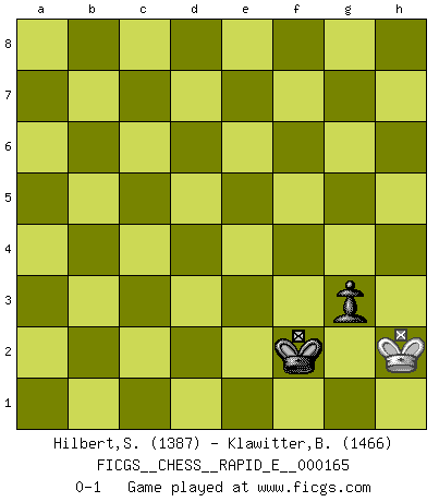 Last move : 0-1 2016 March 28 20:43:57 [Event "FICGS__CHESS__RAPID_E__000165"] [Site "FICGS"] [Date "2015.12.13"] [Round "1"] [White "Hilbert,Stephan J."] [Black "Klawitter,Bernd"] [Result "0-1"] [WhiteElo "1387"] [BlackElo "1466"] 1.e4 Nf6 2.e5 Nd5 3.c4 Nb6 4.d4 d6 5.Nf3 Bg4 6.Be2 dxe5 7.Nxe5 Bxe2 8.Qxe2 Qxd4 9.O-O e6 10.Rd1 Qh4 11.Qf3 Qe7 12.Qxb7 Qc5 13.Qe4 Bd6 14.Be3 Qa5 15.Nc6 Qa4 16.Nc3 Qxc6 17.Qxc6+ Nxc6 18.c5 O-O 19.cxd6 cxd6 20.Rxd6 Rfc8 21.Rad1 Nc4 22.Rd7 Nxe3 23.fxe3 Rd8 24.Ne4 Rxd7 25.Rxd7 Rd8 26.Rc7 Ne5 27.Rxa7 h6 28.h3 Rb8 29.b3 Kh7 30.Ra5 Nd3 31.Nd2 Nc1 32.Kf1 Rb7 33.Nc4 Rc7 34.Ke1 Nd3+ 35.Ke2 Nc5 36.Nd2 Nd7 37.a4 Nf6 38.b4 Rc2 39.Kd3 Rc7 40.Rc5 Rd7+ 41.Kc3 Nd5+ 42.Kb3 Nxe3 43.Ne4 Nxg2 44.a5 Nf4 45.h4 Nd5 46.a6 f5 47.Ng3 g5 48.hxg5 hxg5 49.Ra5 Nb6 50.a7 Na8 51.Kc4 Kg6 52.Ra6 f4 53.Ne4 Kf5 54.Nc5 Rd5 55.Nxe6 Re5 56.Nd4+ Kg4 57.b5 Nc7 58.Rc6 Na8 59.b6 Re7 60.Ne6 f3 61.Kb5 f2 62.Rc1 Nxb6 63.Kxb6 Rxe6+ 64.Kc5 Re1 65.Rxe1 fxe1Q 66.a8Q Qe5+ 67.Kc4 Qe2+ 68.Kc3 Qe3+ 69.Kc2 Qc5+ 70.Kd3 Qd6+ 71.Ke3 Qf4+ 72.Ke2 Qh2+ 73.Kf1 Qf4+ 74.Ke2 Qh2+ 75.Kf1 Qf4+ 76.Kg1 Qg3+ 77.Kh1 Qf3+ 78.Qxf3+ Kxf3 79.Kh2 g4 80.Kh1 Kf2 81.Kh2 g3+ 0-1 Alekhine's defense Kingside Castling by player White (move 9) Kingside Castling by player Black (move 18) 10 pieces endgame at move 55 : White KRNPP , Black KRNPP WHITE : King + 1 Rook 1 Knight 2 Pawns BLACK : King + 1 Rook 1 Knight 2 Pawns 9 pieces endgame at move 62 : White KRNP , Black KRNPP WHITE : King + 1 Rook 1 Knight 1 Pawn BLACK : King + 1 Rook 1 Knight 2 Pawns 8 pieces endgame at move 63 : White KRNP , Black KRPP WHITE : King + 1 Rook 1 Knight 1 Pawn BLACK : King + 1 Rook 2 Pawns 7 pieces endgame at move 63 : White KRP , Black KRPP WHITE : King + 1 Rook 1 Pawn BLACK : King + 1 Rook 2 Pawns 6 pieces endgame at move 65 : White KRP , Black KPP WHITE : King + 1 Rook 1 Pawn BLACK : King + 2 Pawns Promotion Queen by player Black (move 65) 5 pieces endgame at move 65 : White KP , Black KQP WHITE : King + 1 Pawn BLACK : King + 1 Queen 1 Pawn Promotion Queen by player White (move 66) 4 pieces endgame at move 78 : White KQ , Black KP WHITE : King + 1 Queen BLACK : King + 1 Pawn 3 pieces endgame at move 78 : White K , Black KP WHITE : King + BLACK : King + 1 Pawn Player Black won this chess game. Follow this game move after move (download)The passion for playing Chess is one of the most unaccountable in the world. (H.G. Wells) Vielleicht wirkt die Aura früherer Spieler glanzvoller als die der heutigen Spieler, aber das liegt daran, dass man kein Programm wie Fritz hatte, das einem all die Löcher in ihren Partien zeigt. (Vladimir Kramnik) Después de una mala apertura, hay una esperanza en el juego medio. Pero una vez que estas en finales, el momento de la verdad ha llegado. (Edmar Mednis) On peut tirer plus d'utilité d'une partie perdue que de 100 parties gagnées. (Capablanca) If you have any trouble condescending, find a Unix user to show you how it's done. (Scott Adams)