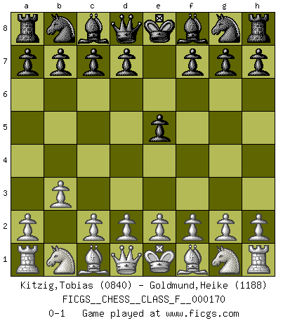 Last move : 0-1 2016 January 26 12:37:43 [Event "FICGS__CHESS__CLASS_F__000170"] [Site "FICGS"] [Date "2015.12.13"] [Round "1"] [White "Kitzig,Tobias"] [Black "Goldmund,Heike"] [Result "0-1"] [WhiteElo "0840"] [BlackElo "1188"] 1.b3 e5 0-1 This chess game has been lost on time (started : 2015.12.13 4:20:24) Nimzovich-Larsen attack : Modern variation Player Black won this chess game. Follow this game move after move (download)I play correspondence chess because it is both art and science while chess is art only. (A player at FICGS) Ich verstehe mehr vom Schach als irgendein anderer lebender Meister. (José Raúl Capablanca) En manos de Fischer's, una diminuta ventaja teórica es tan buena como tener una Reina de ventaja. (Isaac Kashdan) Il vaut toujours mieux jouer un plan faux de façon logique que de n'avoir pas de plan du tout. (Victor Kortchnoï) The absolute truth is the thing that makes people laugh. (Carl Reiner)