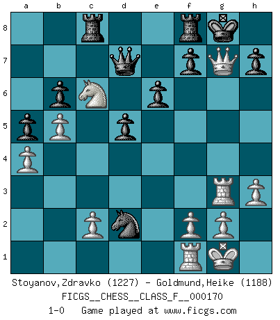 Last move : 1-0 2016 January 16 19:57:11 [Event "FICGS__CHESS__CLASS_F__000170"] [Site "FICGS"] [Date "2015.12.13"] [Round "1"] [White "Stoyanov,Zdravko"] [Black "Goldmund,Heike"] [Result "1-0"] [WhiteElo "1227"] [BlackElo "1188"] 1.e4 d5 2.e5 Bf5 3.a3 e6 4.d4 c5 5.dxc5 Bxc5 6.Nf3 Ne7 7.b4 Bb6 8.Bb5+ Nd7 9.O-O O-O 10.Bxd7 Qxd7 11.a4 a5 12.b5 Ng6 13.Nbd2 Bc5 14.Nb3 Bb4 15.Ba3 Bxa3 16.Rxa3 b6 17.Nbd4 Bg4 18.h3 Bxf3 19.Nxf3 Rac8 20.Nd4 Nxe5 21.Re3 Nc4 22.Rg3 Nb2 23.Qa1 Nc4 24.Nc6 Nd2 25.Qxg7+ 1-0 Scandinavian (centre counter) defense Kingside Castling by player White (move 9) Kingside Castling by player Black (move 9) Player White won this chess game. Follow this game move after move (download)There are tough players and nice guys, and I'm a tough player. (Bobby Fischer) Jeder leidlich begabte Spieler, er braucht keineswegs hervorragend veranlagt zu sein, kann es zum Meister bringen. Aber das ist ja auch gar nicht nötig! Der richtige Standpunkt ist es, zu seinem Vergnügen zu spielen, und man glaube ja nicht, dass der Genuss proportional dem Können sei. (Siegbert Tarrasch) Si yo gano un torneo, yo lo gano por mí mismo. Yo hago las jugadas. Nadie me ayuda. (Bobby Fischer) On entre au jeu d'Echecs comme on entre en Religion. Pour le joueur d'Echecs, la partie d'Echecs c'est l'office, la messe, le défilé du 1er Mai, le dépôt de gerbe au Monument aux Morts. C'est un drame sacré. (Michel Roos) Optimism is a variety of information deficit. Sometimes especially true for correspondence chess games. (Michael Aigner)