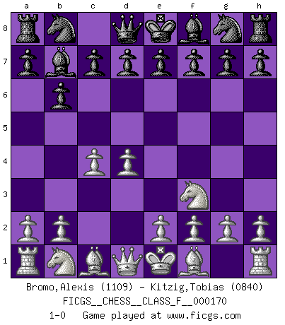 Last move : 1-0 2016 February 4 13:33:40 [Event "FICGS__CHESS__CLASS_F__000170"] [Site "FICGS"] [Date "2015.12.13"] [Round "1"] [White "Bromo,Alexis"] [Black "Kitzig,Tobias"] [Result "1-0"] [WhiteElo "1109"] [BlackElo "0840"] 1.d4 b6 2.c4 Bb7 3.Nf3 1-0 This chess game has been lost on time (started : 2015.12.13 4:20:24) Queen's pawn : English defense Player White won this chess game. Follow this game move after move (download)You sit at the board and suddenly your heart leaps. Your hand trembles to pick up the piece and move it. But what Chess teaches you is that you must sit there calmly and think about whether it's really a good idea and whether there are other better ideas. (Stanley Kubrick) Jede Eröffnung ist gut genug um gespielt zu werden, wenn nur ihr Ruf schlecht genug ist. (Savielly Grigorievitsch Tartakower) El Ajedrez es sobre todo, ¡una pelea!. (Emanuel Lasker) Ce n'est pas pour s'amuser qu'il joue aux échecs : il célèbre un culte. (Vladimir Nabokov) You cannot beat a roulette table unless you steal money from it. (Albert Einstein)