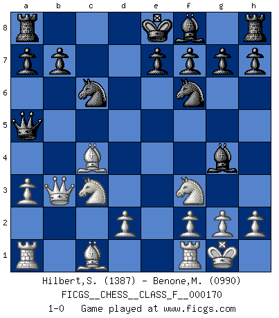 Last move : 1-0 2016 February 9 2:0:54 [Event "FICGS__CHESS__CLASS_F__000170"] [Site "FICGS"] [Date "2015.12.13"] [Round "1"] [White "Hilbert,Stephan J."] [Black "Benone,Mateia"] [Result "1-0"] [WhiteElo "1387"] [BlackElo "0990"] 1.e4 c5 2.b4 cxb4 3.a3 d5 4.exd5 Qxd5 5.Nf3 Nc6 6.c4 bxc3 7.Nxc3 Qa5 8.Bc4 Nf6 9.O-O Bg4 10.Qb3 1-0 This chess game has been lost on time (started : 2015.12.13 4:20:24) Sicilian : wing gambit, Marshall variation Kingside Castling by player White (move 9) Player White won this chess game. Follow this game move after move (download)You know, comrade Pachman, I don't enjoy being a Minister, I would rather play Chess like you. (Che Guevara) Das Zentrum ist der Balkan des Schachbretts - Kriegshandlungen können in jedem Moment ausbrechen. (Aaron Nimzowitsch) Debes de llevar a tu oponente hacia un profundo y obscuro bosque donde 2+2=5, y el camino que conduce a la salida es suficientemente ancho para solamente uno. (Mikhail Tal) Le moment que je préfère le plus dans une rencontre, c'est celui où je sens que la personnalité de l'adversaire se brise. (Robert Fischer) If passion drives you, let reason holds the reins. (Benjamin Franklin)