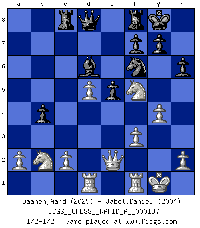 Last move : 1/2-1/2 2015 December 31 20:45:16 [Event "FICGS__CHESS__RAPID_A__000187"] [Site "FICGS"] [Date "2015.12.13"] [Round "1"] [White "Daanen,Aard"] [Black "Jabot,Daniel"] [Result "1/2-1/2"] [WhiteElo "2029"] [BlackElo "2004"] 1.e4 c5 2.Nf3 d6 3.d4 cxd4 4.Nxd4 Nf6 5.Nc3 a6 6.f3 e6 7.Be3 b5 8.g4 h6 9.Qd2 b4 10.Nce2 e5 11.Nb3 a5 12.Ng3 a4 13.Nc1 d5 14.Bb5+ Bd7 15.Bxd7+ Nbxd7 16.exd5 Nb6 17.O-O Nc4 18.Qe2 Nxe3 19.Qxe3 Bd6 20.Nf5 O-O 21.Nd3 a3 22.Rad1 axb2 23.Nxb2 Rc8 24.Qe2 1/2-1/2 Sicilian : Najdorf Kingside Castling by player White (move 17) Kingside Castling by player Black (move 20) This chess game ended in a draw. Follow this game move after move (download)When you absolutely don't know what to do anymore, it is time to panic. (John van der Wiel) Der Freibauer hat für mich eine Seele, genau wie der Mensch, Wünsche, die unerkannt in ihm schlummern, und Befürchtungen, von deren Existenz er selbst kaum ahnt. (Aaron Nimzowitsch) La vida es como un juego de Ajedrez, cambiando con cada movimiento. (Proverbio Chino) Je ne crois pas en la psychologie, je crois aux bons coups. (Robert Fischer) Perhaps the current trend of many chess professionals taking up the more lucrative pastime of poker is not a wholly negative one. It may not be too late for humans to relearn how to take risks in order to innovate and thereby maintain the advanced lifestyles we enjoy. And if it takes a poker-playing supercomputer to remind us that we can't enjoy the rewards without taking the risks, so be it. (The Chess Master and the Computer, by Garry Kasparov - 2010)