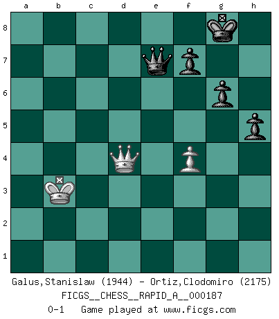 Last move : 0-1 2016 March 24 12:48:33 [Event "FICGS__CHESS__RAPID_A__000187"] [Site "FICGS"] [Date "2015.12.13"] [Round "1"] [White "Galus,Stanislaw"] [Black "Ortiz,Clodomiro"] [Result "0-1"] [WhiteElo "1944"] [BlackElo "2175"] 1.d4 Nf6 2.c4 e6 3.Nf3 b6 4.a3 Bb7 5.Nc3 d5 6.cxd5 Nxd5 7.e3 Nxc3 8.bxc3 Bd6 9.Bd3 c5 10.e4 O-O 11.Be3 Qc7 12.O-O Nc6 13.e5 Be7 14.Qb1 h6 15.Bh7+ Kh8 16.Bc2 Rfc8 17.Rc1 Na5 18.Qb5 Qd8 19.Qd3 Qg8 20.Nd2 Rd8 21.Qe2 Rac8 22.a4 Rd7 23.Bd3 Qd8 24.Qh5 Bf8 25.Rd1 cxd4 26.cxd4 Rc3 27.Bb5 Rdc7 28.Qg4 Qa8 29.Rab1 Bd5 30.Ra1 Nc6 31.Nf1 Nb4 32.Bd2 Rb3 33.Rab1 Rxb1 34.Rxb1 Nc2 35.Bd3 Na3 36.Ra1 Nc4 37.Be1 Nb2 38.Be2 Qc8 39.Bd2 Nc4 40.Bf4 Na5 41.Be3 Bb7 42.h3 Nc4 43.Bf4 Qd7 44.Bc1 a6 45.Ne3 b5 46.axb5 axb5 47.Nxc4 bxc4 48.Bd1 Rc8 49.Bc2 Bd5 50.Qf4 Kg8 51.Qd2 c3 52.Qd3 g6 53.f3 Qb7 54.Kf2 Qb4 55.Ra3 Bc4 56.Qe3 Qb6 57.Ra1 Bd5 58.Qd3 Bb3 59.Be3 Bxc2 60.Qxc2 Qc7 61.Rc1 Kg7 62.Kg3 Qc4 63.h4 Be7 64.Ra1 Qc7 65.Ra2 Bd8 66.Kh3 h5 67.Ra4 Qc6 68.Kg3 Qd5 69.Ra3 Qc6 70.Ra1 Qd7 71.Rc1 Qc7 72.Ra1 Qb7 73.Ra2 Qe7 74.Bg5 Qb4 75.Be3 Qc4 76.Ra7 Bb6 77.Ra4 Qd5 78.Kf2 Rc4 79.Qa2 Rxd4 80.Bxd4 Bxd4+ 81.Ke2 Qb5+ 82.Rc4 Qxe5+ 83.Kd1 Qb5 84.Kc2 Bf6 85.Re4 Qb7 86.Kd3 Qd7+ 87.Kc2 Kh7 88.Rc4 Qd5 89.Kb3 Qd7 90.Rb4 Qd5+ 91.Rc4 Be5 92.Qb1 Qb5+ 93.Rb4 Qd5+ 94.Rc4 Qb5+ 95.Rb4 Qd7 96.Qe4 Bf6 97.Rc4 Qb5+ 98.Rb4 Qf1 99.Qc2 Kg7 100.f4 Qe1 101.Rc4 Qh1 102.Rxc3 Bxc3 103.Qxc3+ Kh7 104.g3 Qb1+ 105.Kc4 Qd1 106.Kb4 Qd5 107.Ka3 Qb5 108.Qe3 Qa5+ 109.Kb3 Kg7 110.Qd4+ Kf8 111.Qd6+ Kg8 112.Kc2 Qf5+ 113.Kc3 Qe4 114.Qb6 Qe1+ 115.Kc4 Qc1+ 116.Kd3 Qd1+ 117.Kc3 Kg7 118.Qb8 Qe1+ 119.Kc4 Qe4+ 120.Kc3 Qe3+ 121.Kc2 Qxg3 122.Qe5+ Kg8 123.Qf6 Qf2+ 124.Kb3 e5 125.Qxe5 Qxh4 126.Qd4 Qe7 0-1 Queen's Indian : Petrosian system Kingside Castling by player Black (move 10) Kingside Castling by player White (move 12) 10 pieces endgame at move 121 : White KQPP , Black KQPPPP WHITE : King + 1 Queen 2 Pawns BLACK : King + 1 Queen 4 Pawns 9 pieces endgame at move 125 : White KQPP , Black KQPPP WHITE : King + 1 Queen 2 Pawns BLACK : King + 1 Queen 3 Pawns 8 pieces endgame at move 125 : White KQP , Black KQPPP WHITE : King + 1 Queen 1 Pawn BLACK : King + 1 Queen 3 Pawns Player Black won this chess game. Follow this game move after move (download)Good positions don't win games, good moves do. (Gerald Abrahams) Schach ist mein Leben, meine Leidenschaft, was ich gelernt habe und seit meinem 14. Lebensjahr profimässig praktiziere. Darauf zu verzichten, würde mir sehr schwer fallen. (Viktor Kortschnoi) Me dio la sensación de como si yo estuviera jugando en contra del mismo Ajedrez. - al estar jugando en contra de Robert Fischer (Walter Shipman) Je crois qu'il existe des manières très spécifiques de jouer efficacement contre une machine. Evidemment, nous n'avons aucune chance en technique pure, parce que l'ordinateur calcule de manière parfaite. Mais lorsque nous faisons appel à notre cerveau, en utilisant l'intuition et la compréhension, alors nous restons beaucoup plus forts. (Anatoli Karpov) The production of too many useful things results in too many useless people. (Karl Marx)