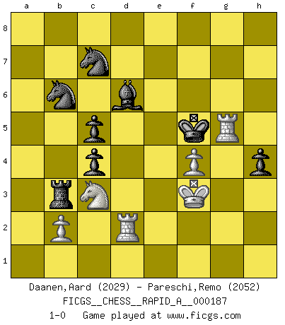 Last move : 1-0 2016 March 12 20:28:21 [Event "FICGS__CHESS__RAPID_A__000187"] [Site "FICGS"] [Date "2015.12.13"] [Round "1"] [White "Daanen,Aard"] [Black "Pareschi,Remo"] [Result "1-0"] [WhiteElo "2029"] [BlackElo "2052"] 1.d4 Nf6 2.c4 c5 3.d5 d6 4.Nc3 e5 5.e4 Be7 6.Nge2 h5 7.Ng1 O-O 8.Nf3 Nh7 9.h3 f5 10.exf5 Bxf5 11.Bd3 Qd7 12.O-O Bxd3 13.Qxd3 Qf5 14.Qe2 Nd7 15.a4 g5 16.Ra3 g4 17.hxg4 Qxg4 18.Nh2 Qxe2 19.Nxe2 a6 20.Rh3 b5 21.axb5 axb5 22.Bh6 bxc4 23.Rg3+ Kh8 24.Bg7+ Kg8 25.Bxf8 Kxf8 26.Ra3 Rb8 27.Rb1 Nhf6 28.Nc3 Nb6 29.Rd1 Kg7 30.Nf3 Kg6 31.g3 Nc8 32.Ra2 Kf7 33.Kg2 Rb7 34.Ra8 Nb6 35.Ra5 Ne8 36.Nd2 Nc7 37.Nde4 Nc8 38.Rd2 Kg6 39.f4 exf4 40.gxf4 Kf5 41.Kf3 h4 42.Ra1 Rb3 43.Rg1 Nb6 44.Nxc5 dxc5 45.d6 Bxd6 46.Rg5+ 1-0 Benoni defense, Hromodka system Kingside Castling by player Black (move 7) Kingside Castling by player White (move 12) Player White won this chess game. Follow this game move after move (download)Chess is 99 percent tactics. (Teichmann) Man kann eine Schachpartie nur gewinnen, wenn das Gleichgewicht gestört ist. In einer Stellung mit ungestörtem Gleichgewicht ist auch das größte Genie hilflos - in der Stellung steckt dann eben kein genialer Einfall. (Wilhelm Steinitz) El Ajedrez hace al hombre ser mas sabio y ver mas claro. (Vladimir Putin) La vie est comme un jeu d'échecs : nous esquissons un plan, mais celui-ci est tributaire de ce que daignent faire l'adversaire aux échecs et le destin dans la vie. (Arthur Schopenhauer) Two beer, or not two beer. (Unknown)