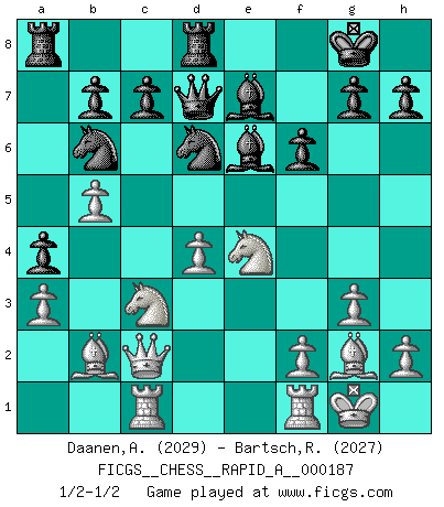 Last move : 1/2-1/2 2015 December 21 9:4:12 [Event "FICGS__CHESS__RAPID_A__000187"] [Site "FICGS"] [Date "2015.12.13"] [Round "1"] [White "Daanen,Aard"] [Black "Bartsch,Reinhard Andrea"] [Result "1/2-1/2"] [WhiteElo "2029"] [BlackElo "2027"] 1.c4 Nf6 2.Nc3 e5 3.Nf3 Nc6 4.g3 d5 5.cxd5 Nxd5 6.Bg2 Nb6 7.O-O Be7 8.d3 Be6 9.a3 O-O 10.b4 a5 11.b5 Nd4 12.Rb1 f6 13.Nd2 Qc8 14.e3 Nf5 15.Qc2 Rd8 16.Bb2 Nd6 17.Rbc1 Qd7 18.d4 exd4 19.exd4 a4 20.Nde4 1/2-1/2 English Opening Kingside Castling by player White (move 7) Kingside Castling by player Black (move 9) This chess game ended in a draw. Follow this game move after move (download)In complicated positions, Bobby Fischer hardly had to be afraid of anybody. (Paul Keres) Es ist wirklich schade, dass so viele Schachspieler nicht auf ihr Äußeres achten! (Alexandra Kosteniuk) Cuando tengas duda... ¡juega al Ajedrez!. (Tevis) Aux échecs, les retours au sommet sont rares : les dommages psychologiques consécutifs à une défaite sont trop sévères. (Daily Telegraph) The leaves of memory seemed to make a mournful rustling in the dark. (Henry Wadsworth Longfellow)