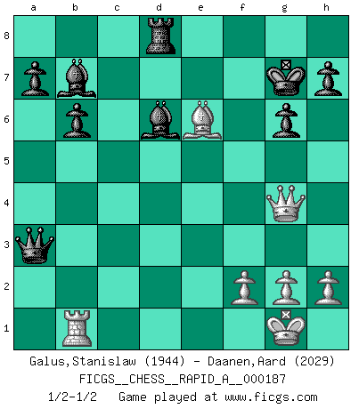 Last move : 1/2-1/2 2015 December 28 21:57:39 [Event "FICGS__CHESS__RAPID_A__000187"] [Site "FICGS"] [Date "2015.12.13"] [Round "1"] [White "Galus,Stanislaw"] [Black "Daanen,Aard"] [Result "1/2-1/2"] [WhiteElo "1944"] [BlackElo "2029"] 1.d4 Nf6 2.c4 g6 3.Nc3 d5 4.cxd5 Nxd5 5.e4 Nxc3 6.bxc3 Bg7 7.Nf3 c5 8.Rb1 O-O 9.Be2 cxd4 10.cxd4 Qa5+ 11.Bd2 Qxa2 12.O-O b6 13.Qc1 Bb7 14.Bc4 Qa4 15.Bb5 Qa2 16.Re1 Rc8 17.Qd1 e6 18.Ba4 Nc6 19.d5 exd5 20.Bb3 Qa3 21.exd5 Nd4 22.Nxd4 Bxd4 23.Bg5 Bc5 24.d6 Bxd6 25.Re6 Rd8 26.Bxd8 Rxd8 27.Qg4 fxe6 28.Bxe6+ Kg7 1/2-1/2 King's Indian defense, 3.Nc3 Kingside Castling by player Black (move 8) Kingside Castling by player White (move 12) This chess game ended in a draw. Follow this game move after move (download)When I have White, I win because I am white; When I have Black, I win because I am Bogolyubov. (Bogolyubov) Die Auseinandersetzung mit Karpow war politisch geprägt. Er stand für das kommunistische System, wurde von dessen Repräsentanten gehätschelt. Ich war der Oppositionelle. Jeder Schachweltmeister spiegelt auch die gesellschaftlichen Verhältnisse wider. Kramnik steht für die Börsen-Generation des Neuen Markts, ideologiefrei, zahlenfixiert. (Garry Kasparov) En el Ajedrez, cuando menos, el valiente hereda la tierra. (Edmar Mednis) Les Echecs sont affaire de jugement sensible. Savoir quand frapper et quand esquiver. (Fischer) Drag your thoughts away from your troubles... by the ears, by the heels, or any other way you can manage it. (Mark Twain)