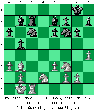 Last move : 0-1 2007 July 14 14:22:52 [Event "FICGS__CHESS__CLASS_A__000019"] [Site "FICGS"] [Date "2007.03.19"] [Round "1"] [White "Porkolab,Sandor"] [Black "Koch,Christian"] [Result "0-1"] [WhiteElo "2115"] [BlackElo "2152"] 1.d4 Nf6 2.Nf3 d5 3.c4 e6 4.Nc3 Be7 5.Bf4 O-O 6.e3 c5 7.dxc5 Bxc5 8.a3 Nc6 9.Qc2 Qa5 10.O-O-O Be7 11.h4 a6 12.Kb1 Rd8 13.Be2 dxc4 14.Bxc4 b5 15.Rxd8+ Nxd8 16.Bd3 Bb7 17.Ne4 Rc8 18.Qd2 Qxd2 19.Nexd2 Nc6 20.Rc1 Rd8 21.Bc2 g6 22.Bc7 Rc8 23.Bb3 Rxc7 0-1 Queen's pawn game Kingside Castling by player Black (move 5) Queenside Castling by player White (move 10) Player Black won this chess game. Follow this game move after move (download)Bobby Fischer is the greatest Chess genius of all time ! (Alexander Kotov) Die Partien sind immer verschieden, die Interviews immer die gleichen. (Garry Kasparov) No hay precio que sea tan grande por la cabellera del Rey enemigo. (Koblentz) Le génie consiste à savoir transgresser les règles au moment opportun. (Teichmann) The large trees attract high winds. (Chinese proverb)
