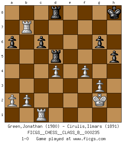 Last move : 1-0 2016 July 4 15:6:43 [Event "FICGS__CHESS__CLASS_B__000235"] [Site "FICGS"] [Date "2015.12.13"] [Round "1"] [White "Green,Jonathan"] [Black "Cirulis,Ilmars"] [Result "1-0"] [WhiteElo "1980"] [BlackElo "1891"] 1.d4 a6 2.c4 e6 3.Nc3 d5 4.cxd5 exd5 5.Bf4 Nc6 6.e3 Bf5 7.Nf3 Nf6 8.Bd3 Bxd3 9.Qxd3 Bb4 10.O-O O-O 11.Bg5 Be7 12.Rac1 Na7 13.Bxf6 Bxf6 14.e4 dxe4 15.Nxe4 Rc8 16.Rfe1 Nb5 17.h3 Nd6 18.Qb3 Nxe4 19.Rxe4 Rb8 20.Ne5 Qd6 21.g3 c6 22.Kg2 Qc7 23.Ng4 Bg5 24.Rce1 Kh8 25.R4e2 Rbd8 26.h4 f5 27.hxg5 fxg4 28.Re7 Qa5 29.Qe6 Qxg5 30.Re4 Qd5 31.Qxd5 Rxd5 32.Rxg4 g6 33.Rh4 h5 34.Rxb7 Rdf5 35.f4 Rd5 36.Rh1 Rfd8 37.Rc1 1-0 Queen's pawn Kingside Castling by player White (move 10) Kingside Castling by player Black (move 10) Player White won this chess game. Follow this game move after move (download)Chess is the gymnasium of the mind. (Blaise Pascal) Herr Iljumschinow ist ein etwas merkwürdiger Geschäftsmann: Er arbeitet zusammen mit Leuten wie Muammar al-Gaddafi; früher ist das Saddam Hussein gewesen. (Joel Lautier) Uno no tiene que jugar muy bien, es suficiente jugar mejor que el oponente. (Siegbert Tarrasch) Il (Jacob Murray) ne joue pas pour le bon coup, mais pour le meilleur. (Eloi Relange) A person who never made a mistake never tried anything new. (Albert Einstein)
