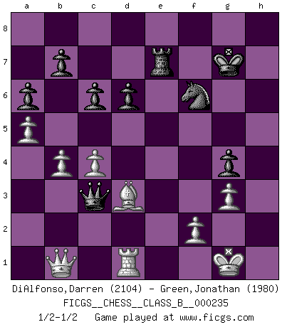 Last move : 1/2-1/2 2016 March 29 15:5:44 [Event "FICGS__CHESS__CLASS_B__000235"] [Site "FICGS"] [Date "2015.12.13"] [Round "1"] [White "DiAlfonso,Darren"] [Black "Green,Jonathan"] [Result "1/2-1/2"] [WhiteElo "2104"] [BlackElo "1980"] 1.d4 f5 2.g3 Nf6 3.Bg2 g6 4.Nf3 Bg7 5.O-O O-O 6.c4 d6 7.Nc3 c6 8.d5 e5 9.dxe6 Bxe6 10.b3 Na6 11.Bb2 Qe7 12.Ng5 Bd7 13.Qd2 h6 14.Nh3 Be6 15.Rad1 Rad8 16.Qc1 Rfe8 17.Rfe1 Nc5 18.Nf4 Bf7 19.e4 fxe4 20.b4 Ncd7 21.h4 g5 22.Nxe4 Nxe4 23.Bxg7 Kxg7 24.Rxe4 Qf6 25.hxg5 hxg5 26.Nh3 Rxe4 27.Bxe4 g4 28.Ng5 Re8 29.Nxf7 Kxf7 30.Qb1 a6 31.a4 Kg7 32.Kg2 Re7 33.Rh1 Qc3 34.Bd3 Nf6 35.a5 Re5 36.Rc1 Qd2 37.Rd1 Qc3 38.Kg1 Re7 1/2-1/2 Dutch defense Kingside Castling by player White (move 5) Kingside Castling by player Black (move 5) This chess game ended in a draw. Follow this game move after move (download)It is not enough to be a good player... you must also play well. (Siegbert Tarrasch) Kasparov stellt für gewöhnlich die Regeln auf und bricht sie dann selbst wieder. (Alexej Shirov) El Ajedrez es en su esencia, un juego. En su forma, un arte. Y en su ejecución, una ciencia. (Baron Tassilo) Botvinnik disait en comparant les échecs à la musique: Il existe une science dont le but est l'étude de l'acoustique et des sons. Mais il y a aussi un art qui se sert de l'océan des sons : c'est la musique. De toute évidence, il en est de même pour la pensée. La logique est l'étude des lois de la réflexion et les échecs reflètent, en tant qu'art, le côté logique de la réflexion, sous la forme d'images artistiques... Extrait de Fischer - Spassky, Reykjavik 1972 par Alexander & F. Wyndham (Ed. Solar), p 37. A good aphorism is too hard for the tooth of time, and is not worn away with the centuries, although it serves as food for every speech. (Friedrich Nietzsche)