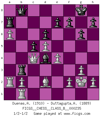 Last move : 1/2-1/2 2016 January 1 9:48:50 [Event "FICGS__CHESS__CLASS_B__000235"] [Site "FICGS"] [Date "2015.12.13"] [Round "1"] [White "Duenas,Alexis"] [Black "Duttagupta,Aniruddha"] [Result "1/2-1/2"] [WhiteElo "1910"] [BlackElo "1889"] 1.d4 Nf6 2.c4 c5 3.d5 b5 4.cxb5 a6 5.bxa6 g6 6.Nc3 Bxa6 7.e4 Bxf1 8.Kxf1 d6 9.Nf3 Bg7 10.g3 O-O 11.Kg2 Nbd7 12.Qe2 Qb6 13.a4 Rfb8 14.Nb5 Ne8 15.Bg5 Kf8 16.Nd2 Qd8 17.Nc4 Nb6 18.Nxb6 Rxb6 19.Rhb1 Nc7 20.Nxc7 Qxc7 21.Ra2 Rb3 22.Bd2 Kg8 23.a5 Qb8 24.Qc4 Bd4 25.a6 Ra7 26.Ba5 Bg7 27.Bd2 Bd4 28.Ba5 Bh8 29.Bd2 Bd4 1/2-1/2 Benko gambit accepted Kingside Castling by player Black (move 10) This chess game ended in a draw. Follow this game move after move (download)Methodical thinking is of more use in Chess than inspiration. (C. J. S. Purdy) Bogoljubow: Matt in vier Zügen! Tartakower: Ich verbitte mir jede Belästigung! (Savielly Grigorievitsch Tartakower) La caracteristica mas importante en la posición del Ajedrez es la actividad de las piezas. Esto es absolutamente fundamental en todas las fases del juego: Apertura, Juego Medio y especialmente Finales. La limitación primordial en la actividad de una pieza, es la estructuración de los Peones. (Michael Stean) On croit qu'il y a plus de mauvais joueurs que de bons joueurs, c'est faux : Il y a autant de joueurs qui gagnent que de joueurs qui perdent. (Philippe Geluck) All war is based on deception. (Sun Tzu)