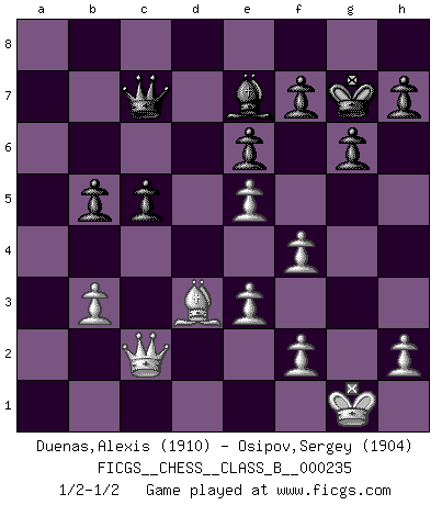 Last move : 1/2-1/2 2015 December 21 12:58:35 [Event "FICGS__CHESS__CLASS_B__000235"] [Site "FICGS"] [Date "2015.12.13"] [Round "1"] [White "Duenas,Alexis"] [Black "Osipov,Sergey"] [Result "1/2-1/2"] [WhiteElo "1910"] [BlackElo "1904"] 1.d4 Nf6 2.c4 e6 3.g3 d5 4.Nf3 Bb4+ 5.Bd2 Be7 6.Bg2 O-O 7.O-O c6 8.Qc2 Nbd7 9.Bf4 b6 10.Rd1 Bb7 11.Nc3 dxc4 12.Nd2 Nd5 13.Nxc4 Nxf4 14.gxf4 Qc7 15.e3 Rfd8 16.Rac1 Rac8 17.Ne5 Nxe5 18.dxe5 a6 19.Ne4 Rb8 20.Rxd8+ Rxd8 21.Rd1 Rxd1+ 22.Qxd1 c5 23.a4 b5 24.axb5 Bxe4 25.Bxe4 axb5 26.Qc2 g6 27.b3 Kg7 28.Bd3 1/2-1/2 Catalan Opening Kingside Castling by player Black (move 6) Kingside Castling by player White (move 7) This chess game ended in a draw. Follow this game move after move (download)The passed Pawn is a criminal, who should be kept under lock and key. Mild measures, such as police surveillance, are not sufficient. (Aaron Nimzovich) Stelle das Brett so, daß die Sonne in die Augen deines Gegners scheint. (Ruy López) La batalla por la última verdad nunca sera ganada. Y es por eso que el Ajedrez es tan fascinante. (Hans Kmoch) En blitz, le Cavalier l'emporte sur le Fou. (Vlastimil Hort) A clear conscience is usually the sign of a bad memory. (Unknown)