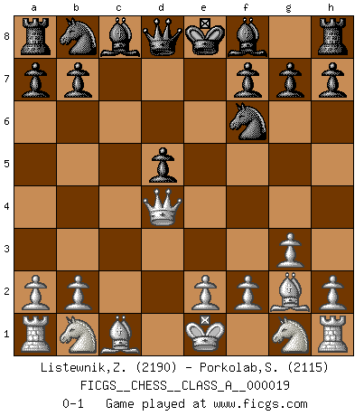 Last move : 0-1 2007 May 29 23:31:44 [Event "FICGS__CHESS__CLASS_A__000019"] [Site "FICGS"] [Date "2007.03.19"] [Round "1"] [White "Listewnik,Zbigniew"] [Black "Porkolab,Sandor"] [Result "0-1"] [WhiteElo "2190"] [BlackElo "2115"] 1.c4 Nf6 2.g3 e5 3.Bg2 c6 4.d4 exd4 5.Qxd4 d5 6.cxd5 cxd5 0-1 English, 1...Nf6 (Anglo-Indian defense) Player Black won this chess game. Follow this game move after move (download)I know people who have all the will in the world, but still can't play good Chess. (Bobby Fischer) Ich habe die besten Aussichten, den ersten Preis zu gewinnen - denn jeder muss gegen Steinitz spielen, nur ich nicht! (Wilhelm Steinitz) En la perfecta combinación de Ajedrez como en una historia corta de primera clase, toda la trama y contra trama deberá conducir hacia un final sorprendente, el interes no es mitigado hasta el último momento. (Yates and Winter) On n'a jamais que l'âge auquel on a commence à jouer aux échecs car après on cesse de vieillir. (Capablanca) Train yourself to let go of everything you fear to lose. (Master Yoda in Star Wars ep.3)