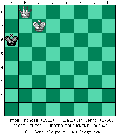 Last move : 1-0 2016 February 21 14:18:42 [Event "FICGS__CHESS__UNRATED_TOURNAMENT__000045"] [Site "FICGS"] [Date "2015.12.19"] [Round "1"] [White "Ramos,Francis"] [Black "Klawitter,Bernd"] [Result "1-0"] [WhiteElo "1513"] [BlackElo "1466"] 1.e4 d5 2.exd5 Qxd5 3.Nc3 Qa5 4.d4 e5 5.dxe5 Bb4 6.Bd2 Qxe5+ 7.Qe2 Qxe2+ 8.Bxe2 Bf5 9.O-O-O Nf6 10.f3 Nbd7 11.h4 O-O-O 12.a3 Ba5 13.g4 Be6 14.Nh3 Rhe8 15.Bb5 a6 16.Bxd7+ Rxd7 17.Ng5 h6 18.Nxe6 Rxe6 19.Rhe1 Rxe1 20.Bxe1 Rxd1+ 21.Kxd1 Bb6 22.Ke2 Kd7 23.Bf2 Bxf2 24.Kxf2 b6 25.Ke3 Kc6 26.Ne4 Nd5+ 27.Kd4 Nf4 28.g5 hxg5 29.hxg5 Ng6 30.Ng3 Nf4 31.Nf5 Ne6+ 32.Ke3 Nxg5 33.Nxg7 Ne6 34.Nxe6 fxe6 35.Ke4 Kd6 36.f4 c5 37.c4 b5 38.cxb5 axb5 39.b3 Ke7 40.Ke5 Kd7 41.f5 exf5 42.Kxf5 Kd6 43.Ke4 Kc6 44.Ke5 b4 45.axb4 cxb4 46.Kd4 Kb5 47.Kd5 Kb6 48.Kc4 Kc6 49.Kxb4 Kb6 50.Kc4 Kc6 51.b4 Kb6 52.b5 Kc7 53.Kc5 Kb7 54.b6 Kb8 55.Kb4 Ka8 56.Ka5 Kb8 57.Kb5 Kb7 58.Kc5 Kc8 59.Kc6 Kb8 60.b7 Ka7 61.Kc7 Ka6 62.b8Q 1-0 Scandinavian : Anderssen counter-attack Queenside Castling by player White (move 9) Queenside Castling by player Black (move 11) 10 pieces endgame at move 34 : White KPPPP , Black KPPPP WHITE : King + 4 Pawns BLACK : King + 4 Pawns 9 pieces endgame at move 38 : White KPPPP , Black KPPP WHITE : King + 4 Pawns BLACK : King + 3 Pawns 8 pieces endgame at move 38 : White KPPP , Black KPPP WHITE : King + 3 Pawns BLACK : King + 3 Pawns 7 pieces endgame at move 41 : White KPP , Black KPPP WHITE : King + 2 Pawns BLACK : King + 3 Pawns 6 pieces endgame at move 42 : White KPP , Black KPP WHITE : King + 2 Pawns BLACK : King + 2 Pawns 5 pieces endgame at move 45 : White KPP , Black KP WHITE : King + 2 Pawns BLACK : King + 1 Pawn 4 pieces endgame at move 45 : White KP , Black KP WHITE : King + 1 Pawn BLACK : King + 1 Pawn 3 pieces endgame at move 49 : White KP , Black K WHITE : King + 1 Pawn BLACK : King + Promotion Queen by player White (move 62) Player White won this chess game. Follow this game move after move (download)Nowadays, when you're not a grandmaster at 14, you can forget about it. (Anand Viswanathan) Wenn Spassky eine Figur opfert kannst du genauso gut aufgeben. Aber wenn Tal eine Figur opfert, spiel weiter. Er könnte noch eine weitere opfern, und dann ... wer weiß? (Miguel Najdorf) Nunca antes ha habido un jugador de Ajedrez con tal conocimiento a fondo de las complejidades del juego y una inmensa voluntad absolutamente indomable de ganar. Yo pienso que Fischer es el jugador mas grande que jamás haya existido. (Lisa Lane) Même un GMI sait rarement calculer sur plus de cinq coups une attaque à sacrifices. (Rudolf Spielmann) Logic : The art of thinking and reasoning in strict accordance with the limitations and incapacities of the human misunderstanding. (Ambrose Bierce)