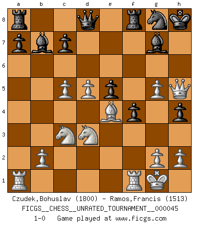 Last move : 1-0 2016 January 29 18:2:17 [Event "FICGS__CHESS__UNRATED_TOURNAMENT__000045"] [Site "FICGS"] [Date "2015.12.19"] [Round "1"] [White "Czudek,Bohuslav"] [Black "Ramos,Francis"] [Result "1-0"] [WhiteElo "1800"] [BlackElo "1513"] 1.c4 Nf6 2.Nc3 g6 3.d4 Bg7 4.e4 d6 5.Be2 O-O 6.Nf3 e5 7.O-O Nc6 8.d5 Ne7 9.Ne1 Nd7 10.Be3 f5 11.f3 f4 12.Bf2 g5 13.Nd3 Nf6 14.a4 h5 15.c5 Ng6 16.a5 g4 17.a6 Kh7 18.axb7 Bxb7 19.fxg4 f3 20.Bxf3 h4 21.g5 Ng8 22.Be3 Nf4 23.Bxf4 exf4 24.e5 dxe5 25.Be4+ Kh8 26.Qh5+ 1-0 English Opening Kingside Castling by player Black (move 5) Kingside Castling by player White (move 7) Player White won this chess game. Follow this game move after move (download)Pawn endings are to Chess what putting is to golf. (Cecil Purdy) Über Frauen: Chess is better. (Robert James Fischer) El Rey es una pieza de pelea. ¡Usenlo!. (Wilhelm Steinitz) Psychologiquement, tu dois avoir confiance en toi même, mais cette confiance doit être basée sur des faits. (Robert Fischer) Life doesn't imitate art, it imitates bad television. (Woody Allen)