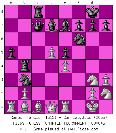 Last move : 0-1 2016 January 6 14:36:51 [Event "FICGS__CHESS__UNRATED_TOURNAMENT__000045"] [Site "FICGS"] [Date "2015.12.19"] [Round "1"] [White "Ramos,Francis"] [Black "Carrizo,Jose"] [Result "0-1"] [WhiteElo "1513"] [BlackElo "2055"] 1.e4 e5 2.Nf3 Nc6 3.Bb5 a6 4.Ba4 Nf6 5.O-O Be7 6.Re1 b5 7.Bb3 d6 8.c3 O-O 9.h3 Na5 10.Bc2 c5 11.d4 Qc7 12.Nbd2 cxd4 13.cxd4 Nc6 14.d5 Nb4 15.Bb1 a5 16.a3 Na6 17.Nf1 Nc5 18.Ng3 Bd7 19.Nh2 Rfc8 20.f4 Rab8 21.fxe5 dxe5 22.Rf1 b4 23.axb4 Rxb4 24.Re1 Nb3 0-1 Ruy Lopez : Closed Kingside Castling by player White (move 5) Kingside Castling by player Black (move 8) Player Black won this chess game. Follow this game move after move (download)The older I grow, the more I value pawns. (Paul Keres) Bobby Fischer ist kein Vorbild für die heutige Jugend. (Viktor Kortschnoi) El Ajedrez lo es todo: arte, ciencia y deporte. (Anatoly Karpov) Si rien de grave n'est détecté lors de l'analyse d'une position, on joue alors le coup. Seconde règle de Blumenfeld. However beautiful the strategy, you should occasionally look at the results. (Winston Churchill)