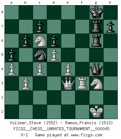 Last move : 0-1 2016 January 14 2:49:29 [Event "FICGS__CHESS__UNRATED_TOURNAMENT__000045"] [Site "FICGS"] [Date "2015.12.19"] [Round "1"] [White "Vollmer,Steve"] [Black "Ramos,Francis"] [Result "0-1"] [WhiteElo "1552"] [BlackElo "1513"] 1.d4 Nf6 2.c4 g6 3.Nc3 Bg7 4.e4 d6 5.Nf3 O-O 6.Be2 e5 7.d5 Nbd7 8.O-O a5 9.a4 Nc5 10.Qc2 Bd7 11.Be3 b6 12.Nd2 Qe7 13.f3 Nh5 14.Rae1 f5 15.g4 fxg4 16.fxg4 Nf4 17.Bxf4 exf4 18.Bf3 Qh4 19.Kh1 Bxg4 20.Nb5 Rf7 21.Bxg4 Qxg4 22.Nf3 Re8 23.b3 Rfe7 24.Nd2 g5 25.Rg1 Qh5 26.Na7 g4 27.Nc6 Rf7 28.Ref1 Kh8 29.Rg2 f3 30.Rg3 Rf6 31.Rf2 Rh6 32.Kg1 Bf6 33.h3 Rg8 34.Nf1 Bh4 35.Qc3+ Rg7 36.hxg4 Bxg3 37.Nxg3 Qxg4 38.Rxf3 Kg8 39.Qe3 Rhg6 0-1 King's Indian : Petrosian system, Main line Kingside Castling by player Black (move 5) Kingside Castling by player White (move 8) Player Black won this chess game. Follow this game move after move (download)If you aren't afraid of Spassky, then I have removed the element of money. (Jim Slater) Im Reiche der Wirklichkeit ist man nie so glücklich wie im Reiche der Gedanken. (Arthur Schopenhauer) Hoy en día, si tu no eres un Gran Maestro a los 14 años, es mejor que lo olvides. (Anand Viswanathan) On croit qu'il y a plus de mauvais joueurs que de bons joueurs, c'est faux : Il y a autant de joueurs qui gagnent que de joueurs qui perdent. (Philippe Geluck) Either move or be moved. (Ezra Pound)