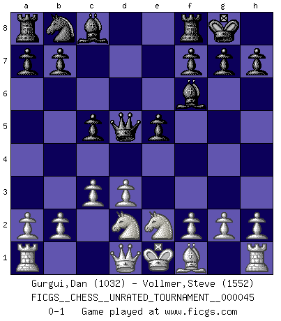Last move : 0-1 2016 January 29 12:53:46 [Event "FICGS__CHESS__UNRATED_TOURNAMENT__000045"] [Site "FICGS"] [Date "2015.12.19"] [Round "1"] [White "Gurgui,Dan"] [Black "Vollmer,Steve"] [Result "0-1"] [WhiteElo "1032"] [BlackElo "1552"] 1.e4 c5 2.Ne2 e5 3.d3 Nf6 4.Bg5 Be7 5.Bxf6 Bxf6 6.Nd2 O-O 7.c3 d5 8.exd5 Qxd5 0-1 This chess game has been lost on time (started : 2015.12.19 13:24:44) Sicilian : Keres variation (2.Ne2) Kingside Castling by player Black (move 6) Player Black won this chess game. Follow this game move after move (download)Chess opens and enriches your mind. (Saudin Robovic) Das Schachspiel ist ein See, in welchem eine Mücke baden und ein Elefant ertrinken kann. (Emanuel Lasker) El ganar no lo es todo... pero el perder es nada. (Mednis) Horreur, mais aussi harmonie suprême : qu'y avait-il en effet au monde en dehors des échecs ? Le brouillard, l'inconnu, le non-être... (Vladimir Nabokov) The real voyage of discovery consists not in seeking new lands but in seeing with new eyes. (Marcel Proust)