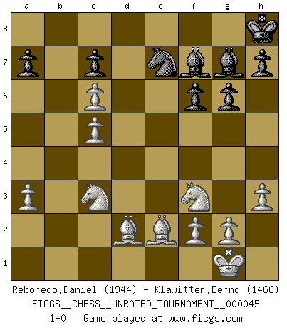 Last move : 1-0 2016 January 30 15:16:11 [Event "FICGS__CHESS__UNRATED_TOURNAMENT__000045"] [Site "FICGS"] [Date "2015.12.19"] [Round "1"] [White "Reboredo,Daniel"] [Black "Klawitter,Bernd"] [Result "1-0"] [WhiteElo "1944"] [BlackElo "1466"] 1.e4 Nf6 2.e5 Nd5 3.d4 d6 4.c4 Nb6 5.Nf3 Bg4 6.exd6 exd6 7.Be2 g6 8.h3 Bd7 9.O-O Bg7 10.Bg5 f6 11.Be3 O-O 12.c5 dxc5 13.dxc5 Nc8 14.Qb3+ Kh8 15.Qxb7 Bc6 16.Qb3 Bd5 17.Qc2 Ne7 18.Nc3 Bf7 19.Rad1 Qc8 20.Rd2 Nbc6 21.a3 Qb7 22.b4 Rad8 23.Rfd1 Rxd2 24.Rxd2 Rd8 25.b5 Rxd2 26.bxc6 Qb2 27.Qxd2 Qxd2 28.Bxd2 1-0 Alekhine's defense Kingside Castling by player White (move 9) Kingside Castling by player Black (move 11) Player White won this chess game. Follow this game move after move (download)I am still a victim of Chess. It has all the beauty of art and much more. It cannot be commercialized. Chess is much purer than art in its social position. (Marcel Duchamp) Offensichtlich kennt Kasparow nichts anderes als Schach, und ich könnte 500 weitere Spieler dieser Sorte benennen. (Judith Polgar) Un Peón pasado es un criminal, quién debe ser mantenido bajo candado y llave. Leves medidas, tales como vigilancia policiaca, no son suficientes. (Aaron Nimzovich) Si je n'étais pas joueur d'échecs, je serais le meilleur dans quelque chose d'autre. (Anatoli Karpov) Information on the Internet is subject to the same rules and regulations as conversation at a bar. (George Lundberg)