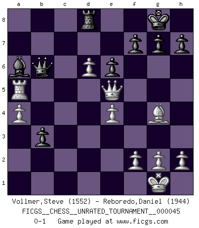 Last move : 0-1 2016 February 14 13:32:6 [Event "FICGS__CHESS__UNRATED_TOURNAMENT__000045"] [Site "FICGS"] [Date "2015.12.19"] [Round "1"] [White "Vollmer,Steve"] [Black "Reboredo,Daniel"] [Result "0-1"] [WhiteElo "1552"] [BlackElo "1944"] 1.d4 d5 2.c4 e6 3.Nc3 Nf6 4.Nf3 Bb4 5.Bg5 dxc4 6.e3 b5 7.a4 c6 8.Be2 Nbd7 9.O-O Qb6 10.Qc2 Bb7 11.b3 cxb3 12.Qxb3 Bxc3 13.Qxc3 b4 14.Qb2 a5 15.Rac1 O-O 16.Bxf6 Nxf6 17.Ne5 Rfd8 18.Bf3 Nd5 19.e4 Nf6 20.Rfd1 Rac8 21.Rc5 Nd7 22.Nc4 Qa6 23.Rc1 Nxc5 24.dxc5 Qa7 25.Nd6 Rxd6 26.cxd6 c5 27.Qe5 Ba6 28.Bg4 Rd8 29.Rxc5 Qb6 30.Rxa5 b3 0-1 QGD : Ragozin, Vienna variation Kingside Castling by player White (move 9) Kingside Castling by player Black (move 15) Player Black won this chess game. Follow this game move after move (download)Mistrust is the most necessary characteristic of the Chess player. (Siegbert Tarrasch) Es liegt in der Natur, vernüftig zu denken und unlogisch zu handeln. (Anatole France) El Ajedrez es un invernadero donde los frutos del carácter pueden madurar mas completamente que en la vida. (Edward Morgan Foster) La tactique est l'élément le plus important du milieu de jeu. (Siegbert Tarrasch) Faith : not wanting to know what is true. (Friedrich Nietzsche)
