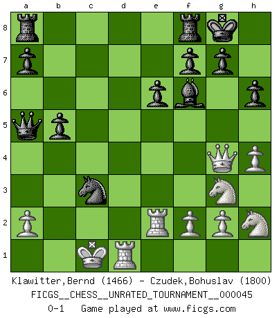 Last move : 0-1 2016 February 8 11:31:15 [Event "FICGS__CHESS__UNRATED_TOURNAMENT__000045"] [Site "FICGS"] [Date "2015.12.19"] [Round "1"] [White "Klawitter,Bernd"] [Black "Czudek,Bohuslav"] [Result "0-1"] [WhiteElo "1466"] [BlackElo "1800"] 1.e4 c6 2.d4 d5 3.Nd2 dxe4 4.Nxe4 Bf5 5.Ng3 Bg6 6.Nf3 Nd7 7.h4 h6 8.Bd3 Bxd3 9.Qxd3 Ngf6 10.Bd2 e6 11.O-O-O Be7 12.Rhe1 O-O 13.c4 b5 14.c5 Nxc5 15.Qe3 Na4 16.Nh2 c5 17.Bc3 Nd5 18.Qd3 Naxc3 19.bxc3 cxd4 20.Qxd4 Bf6 21.Qg4 Qa5 22.Re2 Nxc3 0-1 Caro-Kann : 3.Nd2 Queenside Castling by player White (move 11) Kingside Castling by player Black (move 12) Player Black won this chess game. Follow this game move after move (download)Weak points or holes in the opponent's position must be occupied by pieces not Pawns. (Siegbert Tarrasch) Zu meiner Zeit war ein 20 jähriger ein junger Spieler, heute ist er ein Veteran. (Garry Kasparov) El Ajedrez, como cualquier otra actividad creativa, puede existir solo a través de méritos combinados de aquellos que tienen talento creativo y de aquellos que tienen la habilidad de organizar un trabajo creativo. (Mikhail Botvinnik) Ne tendez aucun piège pour le plaisir ! Ne jouez rien dans l'espoir que l'adversaire réagisse de façon stupide ! Prenez toujours pour acquis que l'adversaire va trouver le meilleur coup ! Ne jouez jamais de coup dans l'espoir que l'adversaire ne voie pas la menace ! Chacun de vos coups doit améliorer la position d'une façon ou d'une autre. Unless in communicating with it one says exactly what one means, trouble is bound to result. (Alan Turing, about computers)