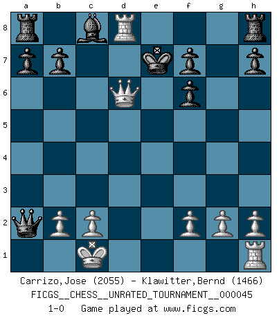 Last move : 1-0 2016 January 19 22:4:50 [Event "FICGS__CHESS__UNRATED_TOURNAMENT__000045"] [Site "FICGS"] [Date "2015.12.19"] [Round "1"] [White "Carrizo,Jose"] [Black "Klawitter,Bernd"] [Result "1-0"] [WhiteElo "2055"] [BlackElo "1466"] 1.e4 d5 2.exd5 Qxd5 3.Nc3 Qd6 4.d4 Nf6 5.Nf3 c6 6.Ne5 Nbd7 7.Nc4 Qc7 8.Qf3 Qd8 9.Bf4 Nb6 10.Be5 Nxc4 11.Bxc4 e6 12.O-O-O Be7 13.Qg3 Kf8 14.d5 exd5 15.Bxd5 cxd5 16.Nxd5 Qa5 17.Nxe7 Qxa2 18.Bxf6 gxf6 19.Rd8+ Kxe7 20.Qd6+ 1-0 Scandinavian : Pytel-Wade variation Queenside Castling by player White (move 12) Player White won this chess game. Follow this game move after move (download)Different people feel differently about resigning. (Bobby Fischer) Als er Schachweltmeister wurde ließ er praktisch alle stärksten Sovietspieler für sich arbeiten. Wenn ein auch nur mittelmässiger Meister ein Spezialist für eine bestimmte Eröffnung war, wurde er von Karpov gerufen. Das wurde alles geheim gehalten. (Mikhail Moiseyevich Botvinik) No hay precio que sea tan grande por la cabellera del Rey enemigo. (Koblentz) Des idées, des idées, j'en ai cent, j'en ai mille. Des bonnes, des mauvaises, applicables, irréalisables... Il suffit de faire le tri ! (Roos) In fact if nothing is done against this teddy bear, hereby I announce that I would quit chess, rapid chess, blitz chess, postal chess, email chess, server chess and correspondence chess I will then switch to a table game where teddy bears aren't going to be seen for a while, like Poker, or Roulette, all 18+ games. (Elmer Valderrama)