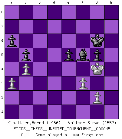 Last move : 0-1 2016 February 1 11:41:37 [Event "FICGS__CHESS__UNRATED_TOURNAMENT__000045"] [Site "FICGS"] [Date "2015.12.19"] [Round "1"] [White "Klawitter,Bernd"] [Black "Vollmer,Steve"] [Result "0-1"] [WhiteElo "1466"] [BlackElo "1552"] 1.e4 c5 2.c3 Nc6 3.d4 cxd4 4.cxd4 e6 5.Nf3 Bb4+ 6.Nc3 Nf6 7.Bd3 O-O 8.O-O Qa5 9.Bd2 d6 10.a3 Bxc3 11.Bxc3 Qd8 12.Qc2 h6 13.h3 Bd7 14.Rac1 Qe7 15.Qb1 Rac8 16.e5 Nd5 17.Bd2 dxe5 18.dxe5 Rfd8 19.Bh7+ Kh8 20.Be4 Be8 21.Bxd5 Rxd5 22.Bc3 Rcd8 23.Rfd1 Qd7 24.Rxd5 Qxd5 25.Qc2 Qd3 26.Qxd3 Rxd3 27.Kh2 Kg8 28.Re1 Bd7 29.Nd2 Nd4 30.Bxd4 Rxd4 31.Nb3 Rd5 32.Re2 g5 33.Rd2 Bc6 34.Rxd5 Bxd5 35.Nd4 a6 36.b4 b5 37.Kg3 Kg7 38.f3 Kg6 39.h4 f6 40.exf6 Kxf6 41.hxg5+ hxg5 42.Kg4 e5 43.Ne2 Kg6 44.Ng3 Be6+ 45.Nf5 Bxf5+ 0-1 Sicilian : Alapin's variation (2.c3) Kingside Castling by player Black (move 7) Kingside Castling by player White (move 8) Player Black won this chess game. Follow this game move after move (download)For me, Chess is life and every game is like a new life. Every Chess player gets to live many lives in one lifetime. (Eduard Gufeld) Stelle das Brett so, daß die Sonne in die Augen deines Gegners scheint. (Ruy López) Nunca antes ha habido un jugador de Ajedrez con tal conocimiento a fondo de las complejidades del juego y una inmensa voluntad absolutamente indomable de ganar. Yo pienso que Fischer es el jugador mas grande que jamás haya existido. (Lisa Lane) Les échecs c'est le défi de l'alpiniste, toujours plus haut, prêt à tout pour monter à l'assaut du Roi ennemi. Les échecs, c'est de la musique en mouvement, un ballet majestueux pour les yeux. C'est de la poésie composée par les fantômes du passé qui au même titre que Rimbaud ou Verlaine méritent notre admiration. Les échecs, c'est de la peinture ou le moindre mouvement modifie le tableau pour en faire un Picasso ou un Van Gogh. Les échecs, c'est tout et rien, c'est la vie et la mort. Jjulie33 sur le forum de France-Echecs. When you don't know what to do, walk fast and look worried. (Anonymous)