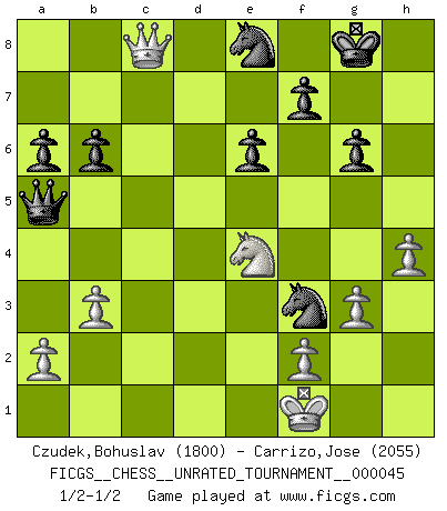 Last move : 1/2-1/2 2016 February 29 15:0:1 [Event "FICGS__CHESS__UNRATED_TOURNAMENT__000045"] [Site "FICGS"] [Date "2015.12.19"] [Round "1"] [White "Czudek,Bohuslav"] [Black "Carrizo,Jose"] [Result "1/2-1/2"] [WhiteElo "1800"] [BlackElo "2055"] 1.c4 e6 2.g3 d5 3.Bg2 dxc4 4.Qa4+ Nd7 5.Qxc4 a6 6.Qc2 c5 7.Nc3 Ngf6 8.Nf3 Qc7 9.O-O b6 10.d4 Bb7 11.Bf4 Bd6 12.Bxd6 Qxd6 13.Rfd1 O-O 14.e4 Qe7 15.Rac1 Rfd8 16.Qe2 h6 17.b3 Rac8 18.e5 Ne8 19.h4 Bxf3 20.Bxf3 cxd4 21.Rxd4 Rc7 22.Kg2 Rdc8 23.Qe3 g6 24.Rd2 Qa3 25.R2d1 Qa5 26.Qxh6 Nxe5 27.Ne4 Rxc1 28.Rxc1 Rxc1 29.Qxc1 Nd3 30.Qc8 Ne1+ 31.Kf1 Nxf3 1/2-1/2 English Opening Kingside Castling by player White (move 9) Kingside Castling by player Black (move 13) This chess game ended in a draw. Follow this game move after move (download)Chess is a more highly symbolic game, but the aggressions are therefore even more frankly represented in the play. It probably began as a war game; that is, the representation of a miniature battle between the forces of two kingdoms. (Karl Meninger) Ivan Sokolov treibt mich als Beifahrer an mit go Loeky go - . (Loek van Wely) Los problemas de Ajedrez exigen del compositor las mismas virtudes que caracterizan todo el arte de valor: originalidad, invención, concisión, armonía, complejidad e insinceridad explendida. (Vladimir Nabokov) Les Echecs sont et restent toujours un combat, un combat intégral comme la boxe, la lutte ou un autre sport, et où il doit y avoir un vainqueur et un vaincu. (Joseph Emil Diemer) The production of too many useful things results in too many useless people. (Karl Marx)