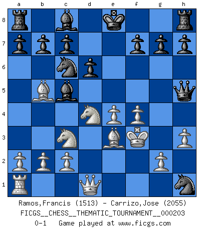 Last move : 0-1 2015 December 26 15:24:26 [Event "FICGS__CHESS__THEMATIC_TOURNAMENT__000203"] [Site "FICGS"] [Date "2015.12.21"] [Round "1"] [White "Ramos,Francis"] [Black "Carrizo,Jose"] [Result "0-1"] [WhiteElo "1513"] [BlackElo "2055"] 1.e4 e5 2.f4 Bc5 3.Nf3 d6 4.Nc3 Nf6 5.h3 Nh5 6.d4 exd4 7.Nxd4 Qh4+ 8.Ke2 Ng3+ 9.Kf3 Nxh1 10.Be3 Nc6 11.Bb5 Qh5+ 0-1 KGD : Classical variation Player Black won this chess game. Follow this game move after move (download)Openings teach you openings. Endgames teach you chess ! (Stephan Gerzadowicz) Es hat in meinem Leben Zeiten gegeben, in denen das Schachspiel, wenn nicht zum Lebenszweck, so doch zu einem regelrechten Lebensersatz geworden ist. Man fühlt sich in solchen Zeiten nicht so, als besäße man eine göttliche Gabe, sondern eher so, als sei man von ihr besessen. (Garry Kasparov) Cada Peón es potencialmente una Reina. (James Mason) Un millionnaire : 'Monsieur Steinitz ! Vous ne participez aux tournois que pour l'argent, alors que moi je n'y viens que pour l'honneur.' Steinitz : 'Chacun joue pour ce qu'il n'a pas'... It's not a bug - it's an undocumented feature. (Anonymous)
