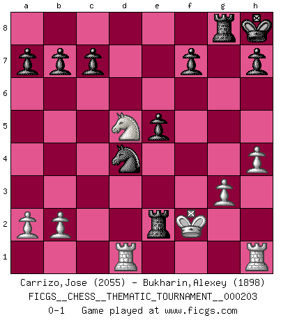 Last move : 0-1 2016 February 5 17:3:8 [Event "FICGS__CHESS__THEMATIC_TOURNAMENT__000203"] [Site "FICGS"] [Date "2015.12.21"] [Round "1"] [White "Carrizo,Jose"] [Black "Bukharin,Alexey"] [Result "0-1"] [WhiteElo "2055"] [BlackElo "1898"] 1.e4 e5 2.f4 exf4 3.Nf3 g5 4.h4 g4 5.Ne5 Nf6 6.d4 d6 7.Nd3 Nxe4 8.Bxf4 Bg7 9.c3 O-O 10.Nd2 Re8 11.Nxe4 Rxe4+ 12.Be2 Nc6 13.g3 Bxd4 14.cxd4 Nxd4 15.Nc1 Qe7 16.Kf2 Qf6 17.Bxg4 Bxg4 18.Qxg4+ Kh8 19.Nd3 Rg8 20.Qd1 Nf5 21.Qf3 Qd4+ 22.Kg2 Qd5 23.Kf2 Nd4 24.Be5+ dxe5 25.Nb4 Nxf3 26.Nxd5 Nd4 27.Rad1 Re2+ 0-1 KGA : Kieseritsky, Berlin defense Kingside Castling by player Black (move 9) Player Black won this chess game. Follow this game move after move (download)No Chess Grandmaster is normal; they only differ in the extent of their madness. (Viktor Korchnoi) Bis zum Jahr 1971 verlief in meiner Schachkariere alles glatt. Dieses dramatische Match [Fischer-Taimanov 6:0] machte mein Leben zur Hölle. (Mark Taimanov) Hasta este punto, las blancas han seguido un análisis bien conocido. Pero ahora el hace un error fatal: empieza a usar su propia cabeza. (Siegbert Tarrasch) On croit qu'il y a plus de mauvais joueurs que de bons joueurs, c'est faux : Il y a autant de joueurs qui gagnent que de joueurs qui perdent. (Philippe Geluck) The weakness of an artist is dogma. (Josh Waitzkin)