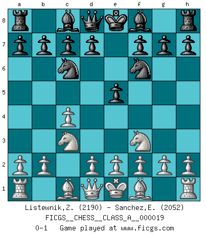 Last move : 0-1 2007 May 26 23:10:56 [Event "FICGS__CHESS__CLASS_A__000019"] [Site "FICGS"] [Date "2007.03.19"] [Round "1"] [White "Listewnik,Zbigniew"] [Black "Sanchez,Eduardo"] [Result "0-1"] [WhiteElo "2190"] [BlackElo "2052"] 1.c4 e5 2.Nc3 Nc6 3.Nf3 Nf6 0-1 English : Four knights system Player Black won this chess game. Follow this game move after move (download)A player surprised is half beaten. (Proverb) Jeder Schachmeister war einmal ein Anfänger. (Irving Chernev) Nunca nadie ha ganado una partida de Ajedrez rindiendose. (Unknown) La menace est plus forte que l'exécution. (Aaron Nimzovitch) Humor is by far the most significant activity of the human brain. (Edward De Bono)