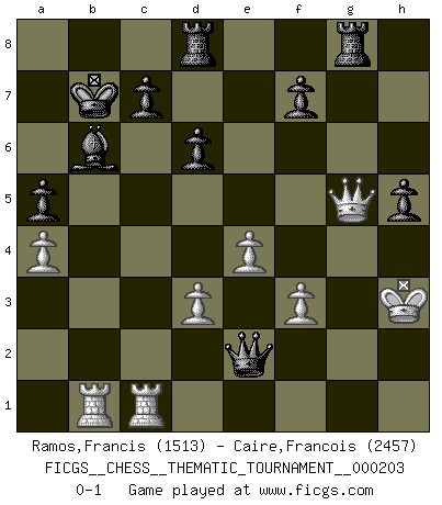 Last move : 0-1 2016 March 7 12:58:53 [Event "FICGS__CHESS__THEMATIC_TOURNAMENT__000203"] [Site "FICGS"] [Date "2015.12.21"] [Round "1"] [White "Ramos,Francis"] [Black "Caire,Francois"] [Result "0-1"] [WhiteElo "1513"] [BlackElo "2457"] 1.e4 e5 2.f4 exf4 3.Nf3 d6 4.Bc4 h6 5.h4 Nf6 6.d3 Nh5 7.Nc3 Be7 8.Ne2 Bg4 9.Bxf4 Bxf3 10.gxf3 Bxh4+ 11.Kf1 Qf6 12.Qd2 Nc6 13.Qe3 O-O-O 14.Bd5 Nxf4 15.Qxf4 Qxb2 16.Kg2 Qxc2 17.Bxc6 Qxe2+ 18.Kh3 Bf2 19.Qf5+ Kb8 20.Bxb7 g6 21.Qg4 Kxb7 22.Rab1+ Bb6 23.a4 a5 24.Rhc1 h5 25.Qf4 g5 26.Qxg5 Rhg8 0-1 KGA : Fischer defense Queenside Castling by player Black (move 13) Player Black won this chess game. Follow this game move after move (download)Fischer prefers to enter Chess history alone. (Miguel Najdorf) Am wohlsten fühle ich mich, wenn ich sehe, wie sich mein Gegner im Todeskampf windet. (Robert James Fischer) Bobby Fischer es el mas grande genio de Ajedrez de todos los tiempos. (Alexander Kotov) Les réformistes prétendent que les progrès de la théorie conduiront à la disparition des échecs, et qu'il faut, pour leur rendre vie, en remanier les règles. En réalité, qu'exprime cette affirmation? Le mépris de l'intuition, de l'imagination et de tous les autres éléments qui font des échecs un art. (Alexander Alekhine) Luck has a peculiar habit of favoring those who don't depend on it. (Author unknown)
