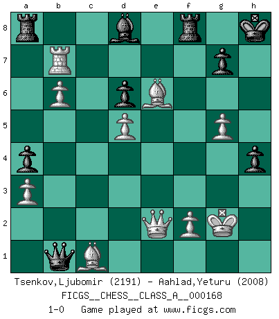 Last move : 1-0 2016 August 12 0:5:28 [Event "FICGS__CHESS__CLASS_A__000168"] [Site "FICGS"] [Date "2015.12.21"] [Round "1"] [White "Tsenkov,Ljubomir"] [Black "Aahlad,Yeturu"] [Result "1-0"] [WhiteElo "2191"] [BlackElo "2008"] 1.c4 e5 2.g3 Nf6 3.Bg2 d5 4.cxd5 Nxd5 5.Nc3 Nb6 6.Nf3 Nc6 7.O-O Be7 8.a3 O-O 9.b4 Be6 10.Rb1 f6 11.d3 a5 12.b5 Nd4 13.Nd2 Qc8 14.e3 Nf5 15.Bb2 Rd8 16.Qc2 Nd6 17.Rfc1 a4 18.Nde4 Bb3 19.Qe2 Nf7 20.Nd2 Be6 21.Nd1 Bf5 22.Ne4 Qd7 23.d4 exd4 24.exd4 Nd6 25.Nxd6 cxd6 26.Ne3 Bxb1 27.Nd5 Nxd5 28.Bxd5+ Kh8 29.Rxb1 Rf8 30.Be6 Qe8 31.d5 f5 32.Bc1 f4 33.Rb4 fxg3 34.hxg3 Qg6 35.Kg2 h5 36.Rc4 Qe8 37.Rc7 Bd8 38.Rxb7 Qg6 39.b6 h4 40.g4 Qb1 41.g5 1-0 English Opening Kingside Castling by player White (move 7) Kingside Castling by player Black (move 8) Player White won this chess game. Follow this game move after move (download)The passed Pawn is a criminal, who should be kept under lock and key. Mild measures, such as police surveillance, are not sufficient. (Aaron Nimzovich) Rubinstein ist ein Turmendspiel, welches die Götter vor tausenden von Jahren begannen. (Savielly Grigorievitsch Tartakower) En la perfecta combinación de Ajedrez como en una historia corta de primera clase, toda la trama y contra trama deberá conducir hacia un final sorprendente, el interes no es mitigado hasta el último momento. (Yates and Winter) A ce moment-là, je menaçais de comprendre la position ! (Clément L'Heureux) The only difference between a tax man and a taxidermist is that the taxidermist leaves the skin. (Mark Twain)
