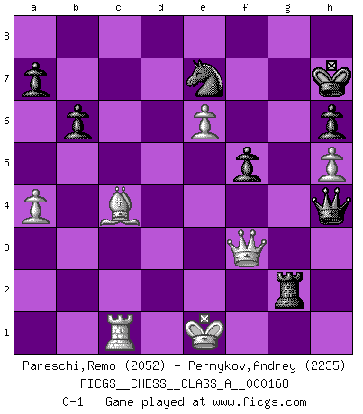 Last move : 0-1 2016 November 20 5:16:22 [Event "FICGS__CHESS__CLASS_A__000168"] [Site "FICGS"] [Date "2015.12.21"] [Round "1"] [White "Pareschi,Remo"] [Black "Permykov,Andrey"] [Result "0-1"] [WhiteElo "2052"] [BlackElo "2235"] 1.c4 e5 2.Nc3 Nf6 3.g3 Bb4 4.Bg2 O-O 5.e4 Bxc3 6.bxc3 c6 7.Nf3 Nxe4 8.O-O d6 9.Re1 Nf6 10.d4 e4 11.Nd2 d5 12.Qb3 Re8 13.Nf1 h6 14.Bf4 b6 15.h3 Be6 16.cxd5 cxd5 17.g4 Nc6 18.Qd1 Ne7 19.Rc1 Rc8 20.Nd2 Qd7 21.Bf1 Nh7 22.a4 Rf8 23.Ba6 Rcd8 24.Bb5 Qb7 25.c4 f5 26.h4 Nf6 27.g5 Ng6 28.Bh2 Ng4 29.cxd5 Nxh2 30.dxe6 Rxd4 31.Qb3 Qe7 32.Kxh2 Rxd2 33.Re2 Rd4 34.Rec2 e3 35.Rc4 Qd6+ 36.Kg1 exf2+ 37.Kf1 Rxc4 38.Bxc4 Kh7 39.h5 Ne7 40.gxh6 Qh2 41.Qe3 gxh6 42.Ke2 f1Q+ 43.Kxf1 Rg8 44.Ke1 Rg3 45.Qd4 Rg4 46.Qf2 Rg2 47.Qf3 Qh4+ 0-1 This chess game has been lost on time (started : 2015.12.21 22:5:46) English : Bremen, Smyslov system Kingside Castling by player Black (move 4) Kingside Castling by player White (move 8) Promotion Queen by player Black (move 42) Player Black won this chess game. Follow this game move after move (download)The stomach is an essential part of the Chess master. (Bent Larsen) Im Wettkampf zwischen starken Meistern kommen Fehler sehr selten vor, deshalb ist es mit bloßem Warten nicht getan. (José Raúl Capablanca) Tu sabes que vas a perder. Aún cuando tenía la ventaja, yo sabía que iba a perder. - al estar jugando con Fischer (Andrew Soltis) Demandez au pauvre Cg1 ce qu'il en pense. Eduard Gufeld à propos de la variante Saemisch de l'Est-Indienne. If you are good, you will be assigned all the work. If you are really good, you will get out of it. (Dan Rotaru)