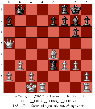 Last move : 1/2-1/2 2016 January 8 15:13:41 [Event "FICGS__CHESS__CLASS_A__000168"] [Site "FICGS"] [Date "2015.12.21"] [Round "1"] [White "Bartsch,Reinhard Andrea"] [Black "Pareschi,Remo"] [Result "1/2-1/2"] [WhiteElo "2027"] [BlackElo "2052"] 1.e4 c5 2.Nf3 d6 3.d4 cxd4 4.Nxd4 Nf6 5.Nc3 g6 6.Be3 Bg7 7.f3 O-O 8.Qd2 Nc6 9.O-O-O d5 10.exd5 Nxd5 11.Nxc6 bxc6 12.Nxd5 cxd5 13.Qxd5 Qc7 14.Qc5 Qb7 15.b3 Bf5 16.Qa5 Rac8 17.Bd3 Rc3 18.Bxf5 Rxe3 19.Be4 Qb8 20.g3 1/2-1/2 Sicilian : Dragon, Yugoslav attack, 7...O-O Kingside Castling by player Black (move 7) Queenside Castling by player White (move 9) This chess game ended in a draw. Follow this game move after move (download)Fischer is under obligation to nobody. (Joseph Platz) Ein unbeabsichtigtes Patt ist der Gipfel der Dummheit. (Anonymous) Nunca nadie ha ganado una partida de Ajedrez rindiendose. (Unknown) Nous vivons dans un monde échiquéen : chaque jour qui passe est un défi à relever. (Philosophe Sasha) All art requires courage. (Anne Tucker)