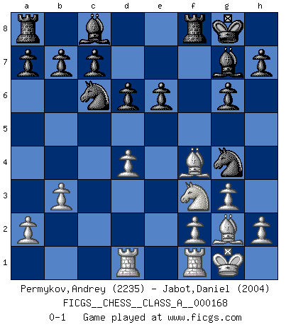 Last move : 0-1 2016 February 8 13:36:22 [Event "FICGS__CHESS__CLASS_A__000168"] [Site "FICGS"] [Date "2015.12.21"] [Round "1"] [White "Permykov,Andrey"] [Black "Jabot,Daniel"] [Result "0-1"] [WhiteElo "2235"] [BlackElo "2004"] 1.d4 f5 2.Nf3 Nf6 3.g3 g6 4.Bg2 Bg7 5.c4 O-O 6.O-O d6 7.Nc3 Qe8 8.Re1 Qf7 9.e4 fxe4 10.Nxe4 Nc6 11.Nc3 Ng4 12.Rf1 Qxc4 13.b3 Qxc3 14.Bd2 Qd3 15.Bf4 Qxd1 16.Raxd1 e6 0-1 Dutch Kingside Castling by player Black (move 5) Kingside Castling by player White (move 6) Player Black won this chess game. Follow this game move after move (download)Suddenly it was obvious to me in my analysis I had missed what Fischer had found with the greatest of ease at the board. (Mikhail Botvinnik) Kombinieren und Schwarzhandel gehören verboten. (Savielly Grigorievitsch Tartakower) El tablero es el mundo, las piezas es el fenomeno del universo, las reglas del juego son lo que llamamos leyes de la naturaleza y el jugador del lado opuesto, se encuentra oculto a nuestra vista. (Thomas Huxley) Dieu déplace le joueur, et celui-ci la pièce. Quel Dieu derrière Dieu commence donc la trame ? Arturo Perez-Reverte (prix de littérature policière 1993). I don't know, I don't care, and it doesn't make any difference. (Albert Einstein)