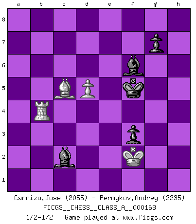 Last move : 1/2-1/2 2016 July 24 18:55:31 [Event "FICGS__CHESS__CLASS_A__000168"] [Site "FICGS"] [Date "2015.12.21"] [Round "1"] [White "Carrizo,Jose"] [Black "Permykov,Andrey"] [Result "1/2-1/2"] [WhiteElo "2055"] [BlackElo "2235"] 1.e4 c5 2.Nf3 d6 3.d4 cxd4 4.Nxd4 Nf6 5.Nc3 a6 6.Be3 e5 7.Nb3 Be6 8.f3 Be7 9.Qd2 h5 10.Nd5 Nxd5 11.exd5 Bf5 12.Na5 Nd7 13.Be2 Bh4+ 14.g3 Bf6 15.O-O O-O 16.Nxb7 Qb8 17.Na5 Qxb2 18.g4 hxg4 19.fxg4 Be4 20.g5 Bd8 21.Nc4 Qxc2 22.Qxc2 Bxc2 23.Rac1 Bg6 24.Nxd6 Rb8 25.h4 Rb2 26.Rf2 Rxa2 27.h5 Rxe2 28.Rxe2 Bxh5 29.Rb2 f5 30.Rb7 f4 31.Ba7 Bg4 32.g6 Be7 33.Nf7 Rxf7 34.gxf7+ Kxf7 35.Bb8 Bf6 36.R1c7 Ke8 37.Rc6 a5 38.Bc7 f3 39.Bxa5 e4 40.Rc8+ Kf7 41.Bb6 Bg5 42.Rc4 Bf5 43.Rxd7+ Bxd7 44.Rxe4 Bf5 45.Ra4 Ke7 46.Ra6 Bf6 47.Bc5+ Kf7 48.Ra3 Kg6 49.Ra7 Bh4 50.Ra4 Bf6 51.Kf2 Bc2 52.Rb4 Kf5 1/2-1/2 Sicilian : Najdorf, Byrne (English) attack Kingside Castling by player White (move 15) Kingside Castling by player Black (move 15) 10 pieces endgame at move 43 : White KRBP , Black KBBPPP WHITE : King + 1 Rook 1 Bishop 1 Pawn BLACK : King + 2 Bishops 3 Pawns 9 pieces endgame at move 44 : White KRBP , Black KBBPP WHITE : King + 1 Rook 1 Bishop 1 Pawn BLACK : King + 2 Bishops 2 Pawns This chess game ended in a draw. Follow this game move after move (download)Any material change in a position must come about by mate, a capture, or a Pawn promotion. (Purdy) Die meiste Zeit treffe ich auf Gegner, die meine Enkel sein könnten. Ich bin da, um ihnen zu zeigen, dass sie von mir noch einiges lernen können. (Viktor Kortschnoi) En posiciones complicadas, Bobby Fischer pocas veces tuvo que temer de cualquiera. (Paul Keres) Ce qui est bien, c'est d'avoir tout un tas de pièces en prise : l'adversaire ne peut en prendre qu'une à la fois. Cité par Thierry Audin. If you have any trouble condescending, find a Unix user to show you how it's done. (Scott Adams)