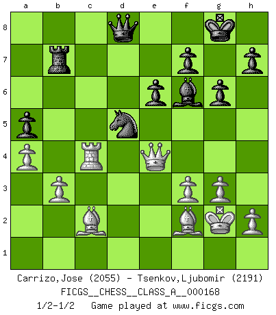 Last move : 1/2-1/2 2016 January 23 8:5:6 [Event "FICGS__CHESS__CLASS_A__000168"] [Site "FICGS"] [Date "2015.12.21"] [Round "1"] [White "Carrizo,Jose"] [Black "Tsenkov,Ljubomir"] [Result "1/2-1/2"] [WhiteElo "2055"] [BlackElo "2191"] 1.e4 c5 2.Nf3 d6 3.d4 cxd4 4.Nxd4 Nf6 5.Nc3 a6 6.Be3 e6 7.f3 b5 8.Qd2 b4 9.Nd1 Be7 10.c3 bxc3 11.Nxc3 Bb7 12.Be2 Nbd7 13.O-O O-O 14.Rfd1 Qb8 15.Rac1 Rd8 16.Bf2 d5 17.exd5 Nxd5 18.Bg3 Qa7 19.Nxd5 Bxd5 20.Kh1 Bf8 21.Qa5 Qb7 22.b3 Nf6 23.Rc2 Bb4 24.Qa4 Qe7 25.Rdc1 Ba3 26.Rb1 Bd6 27.Bf2 Qf8 28.Rd1 g6 29.Nc6 Bxc6 30.Rxc6 Nd5 31.g3 a5 32.Qd4 Be7 33.Rc4 Nb4 34.Qe4 Rxd1+ 35.Bxd1 Bf6 36.a4 Nd5 37.Bc5 Qd8 38.Bc2 Rb8 39.Bf2 Rb7 40.Kg2 1/2-1/2 Sicilian : Najdorf, Byrne (English) attack Kingside Castling by player White (move 13) Kingside Castling by player Black (move 13) This chess game ended in a draw. Follow this game move after move (download)The mistakes are there, waiting to be made. (Savielly Tartakower) Es genügt nicht ein guter Spieler zu sein, man muß auch gut spielen. (Siegbert Tarrasch) En la vida, como en el Ajedrez, los Peones propios obstruyen nuestro camino. La gran fortuna de un hombre, su comodidad, placer, hijos, libros, que deberían ayudarle a ganar, con mucha frecuencia lo ponen en Jaque Mate. (Charles Buxton) Les échecs, c'est l'art d'analyser. (Mikhail Botvinnik) Live, lose, and learn, by observing your opponent how to win. (Amber Steenbock)