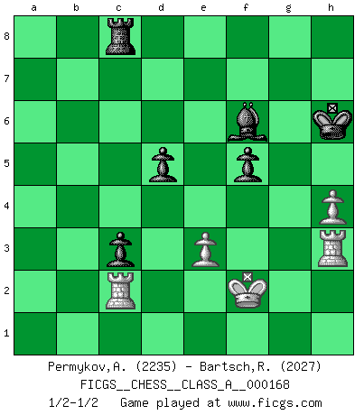 Last move : 1/2-1/2 2016 January 21 18:1:58 [Event "FICGS__CHESS__CLASS_A__000168"] [Site "FICGS"] [Date "2015.12.21"] [Round "1"] [White "Permykov,Andrey"] [Black "Bartsch,Reinhard Andrea"] [Result "1/2-1/2"] [WhiteElo "2235"] [BlackElo "2027"] 1.d4 Nf6 2.c4 e6 3.Nf3 d5 4.Bg5 dxc4 5.Nc3 a6 6.e3 b5 7.a4 c6 8.axb5 cxb5 9.Bxf6 gxf6 10.Nxb5 axb5 11.Rxa8 Bb7 12.Ra1 Bb4+ 13.Ke2 O-O 14.Ne1 Nc6 15.Nc2 Be7 16.Ke1 Nb4 17.Be2 Be4 18.Nxb4 Bxb4+ 19.Kf1 f5 20.h4 f4 21.Kg1 fxe3 22.fxe3 Bd6 23.Bf3 Bd3 24.Qe1 h6 25.Rh3 Bf5 26.g4 Bd3 27.Qf2 f5 28.g5 Qe7 29.Ra6 b4 30.Be2 Rc8 31.Qg2 Bxe2 32.Qxe2 c3 33.bxc3 bxc3 34.Ra2 Qb7 35.Kf2 Be7 36.Qd3 Kg7 37.d5 Qxd5 38.Qxd5 exd5 39.gxh6+ Kxh6 40.Rc2 Bf6 1/2-1/2 Queen's pawn game Kingside Castling by player Black (move 13) This chess game ended in a draw. Follow this game move after move (download)Nothing excites jaded Grandmasters more than a theoretical novelty. (Dominic Lawson) Im Blitz ist es einfacher mit einer Figur weniger anzugreifen, als sich mit einer Mehrfigur zu verteidigen. (Mikhail Nekhemyevich Tal) Las Aperturas te enseñan aperturas. ¡Los Finales te enseñan Ajedrez!. (Stephan Gerzadowicz) Pour moi, les échecs ne sont pas un jeu mais un art. (Alexandre Alekhine) He who fights with monsters should be careful lest he thereby become a monster. (Friedrich Nietzsche, Beyond Good and Evil)