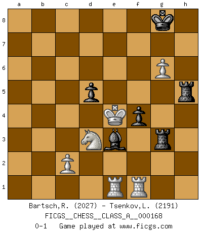 Last move : 0-1 2016 January 9 18:46:6 [Event "FICGS__CHESS__CLASS_A__000168"] [Site "FICGS"] [Date "2015.12.21"] [Round "1"] [White "Bartsch,Reinhard Andrea"] [Black "Tsenkov,Ljubomir"] [Result "0-1"] [WhiteElo "2027"] [BlackElo "2191"] 1.e4 c5 2.Nf3 d6 3.d4 cxd4 4.Nxd4 Nf6 5.Nc3 a6 6.Be3 e5 7.Nb3 Be7 8.Be2 Be6 9.Qd3 O-O 10.O-O Nbd7 11.h3 b5 12.a4 Bc4 13.Qd2 Bxe2 14.Qxe2 b4 15.Nd5 Nxd5 16.exd5 a5 17.Qb5 h6 18.Rac1 f5 19.f3 Bf6 20.Bf2 Bg5 21.Rce1 Qc7 22.h4 Bf6 23.Re2 Rfc8 24.g3 f4 25.g4 Rab8 26.Qd3 e4 27.Rxe4 Bxb2 28.Re7 Bf6 29.Re2 Ne5 30.Qe4 Qf7 31.Nxa5 Rc3 32.Bd4 Nxf3+ 33.Rxf3 Bxd4+ 34.Kf1 Be3 35.h5 Re8 36.Qg6 Rc5 37.Qxf7+ Kxf7 38.Nc6 Rxd5 39.Kg2 Rg5 40.Kh3 Re4 41.Nxb4 Kg8 42.Nd3 Rxa4 43.Re1 g6 44.hxg6 h5 45.gxh5 Rxh5+ 46.Kg4 R4a5 47.R3f1 Rag5+ 48.Kf3 Rg3+ 49.Ke4 d5+ 0-1 Sicilian : Najdorf, Byrne (English) attack Kingside Castling by player Black (move 9) Kingside Castling by player White (move 10) Player Black won this chess game. Follow this game move after move (download)I know people who have all the will in the world, but still can't play good Chess. (Bobby Fischer) Ich bin der einzige Schachspieler, der sich während der Vorbereitungen zum Turnier verletzt hat. (Woody Allen) Debemos de asegurarnos de que el Ajedrez no se convierta en un lenguaje muerto, muy interesante, pero solo para un grupo muy pequeño. (Sytze Faber) Votre prénom est 'Tactique', votre deuxième prénom est 'Tactique' et votre nom est 'Tactique'. (Ken Smith) Men should grow up. - Yeah. And dogs should stop licking themselves. It's not gonna happen. (Gregory House to Dr. Cameron, House M.D.)